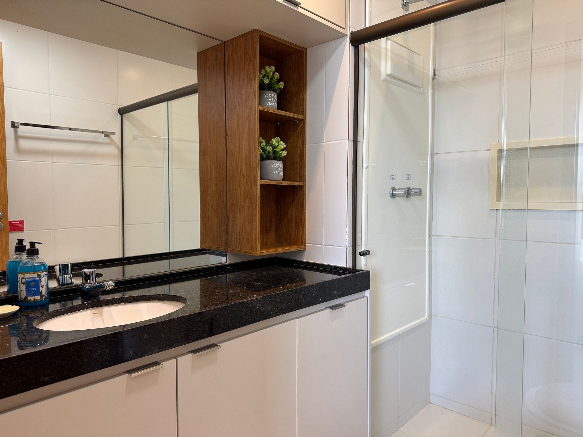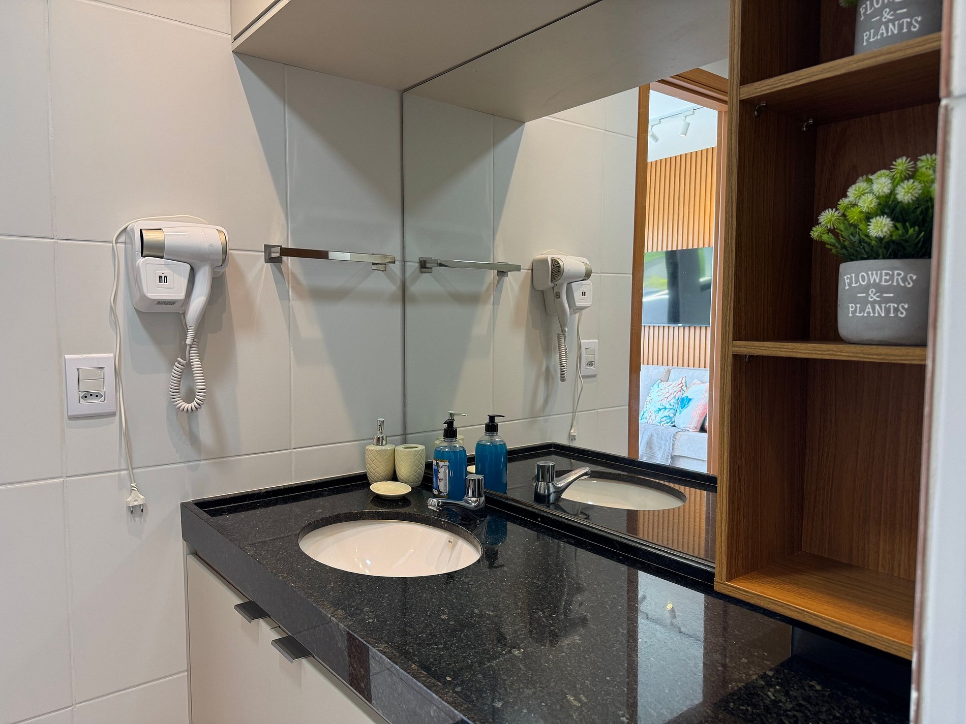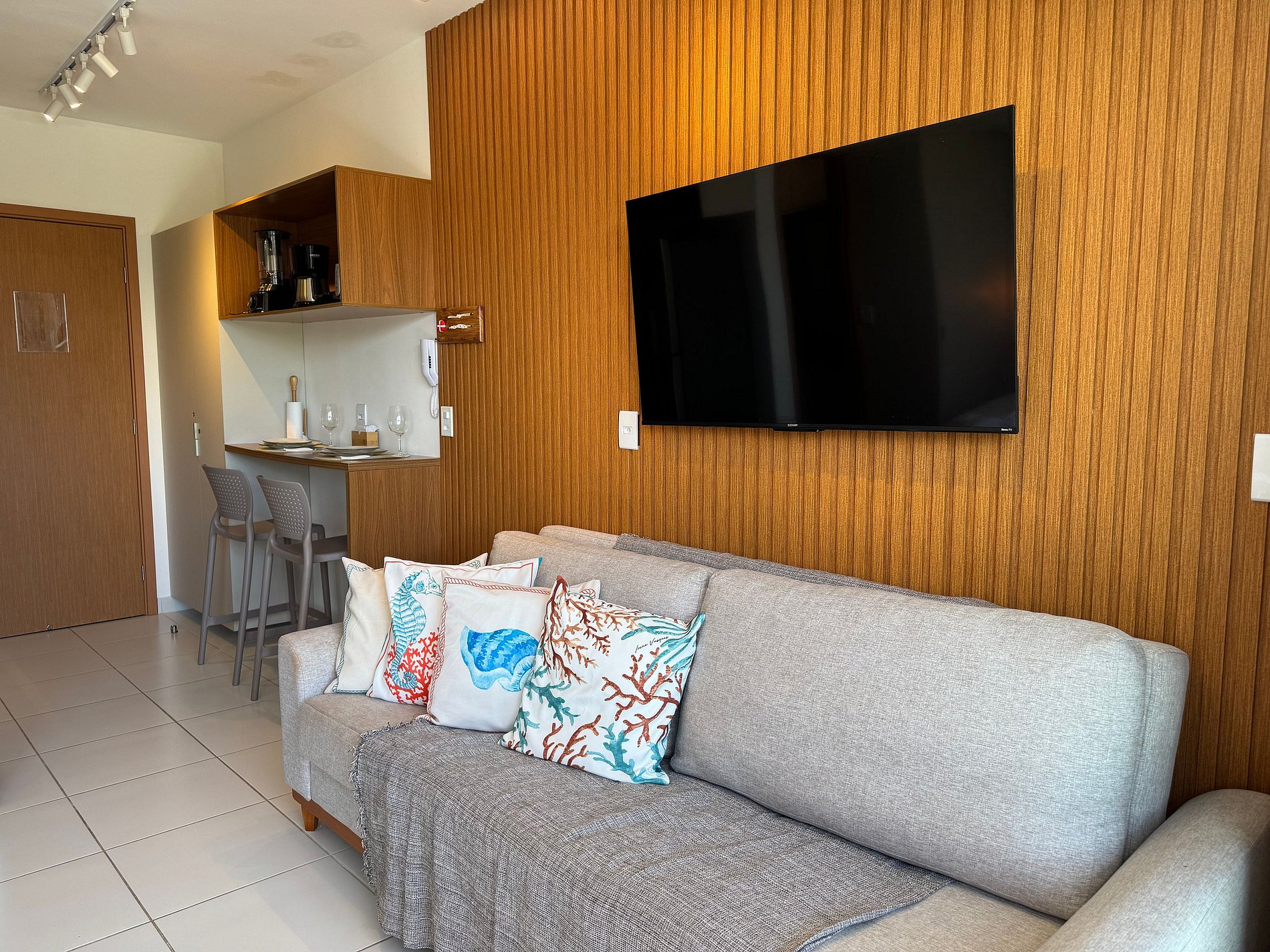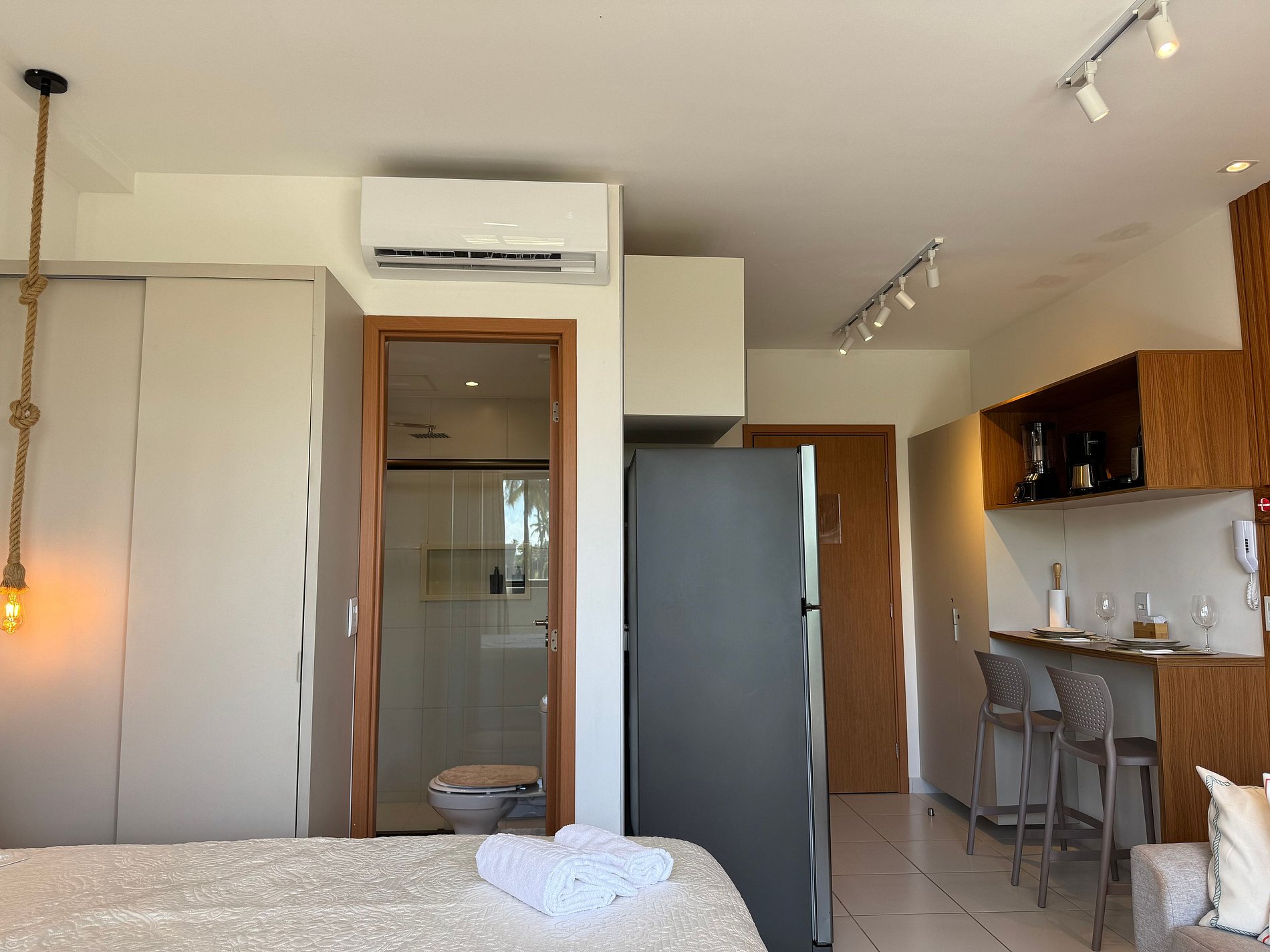O apartamento tem 26m2, uma suíte completa com Smart TV 50", Arcondicionado 19mil Btus, Geladeira, Fogão Elétrico 2 bocas, Forno Microondas e cama casal.