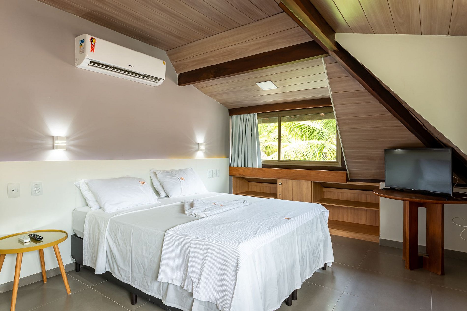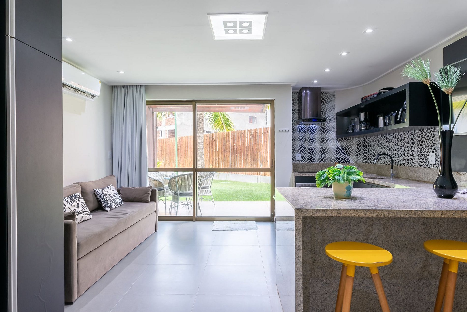 O nosso Bangalô tem 75m2 com padrão elegante e sofisticado, localizado no térreo com terraço e um belíssimo jardim a frente. Tem 2 quartos sendo 1 suíte, em um quarto cama queen e no outro duas camas de solteiro que juntanto pode fazer 1 outra cama de casal (fornecemos roupa de cama e banho), sala e cozinha integrados. Na sala há um sofá-cama para 2 pessoas.