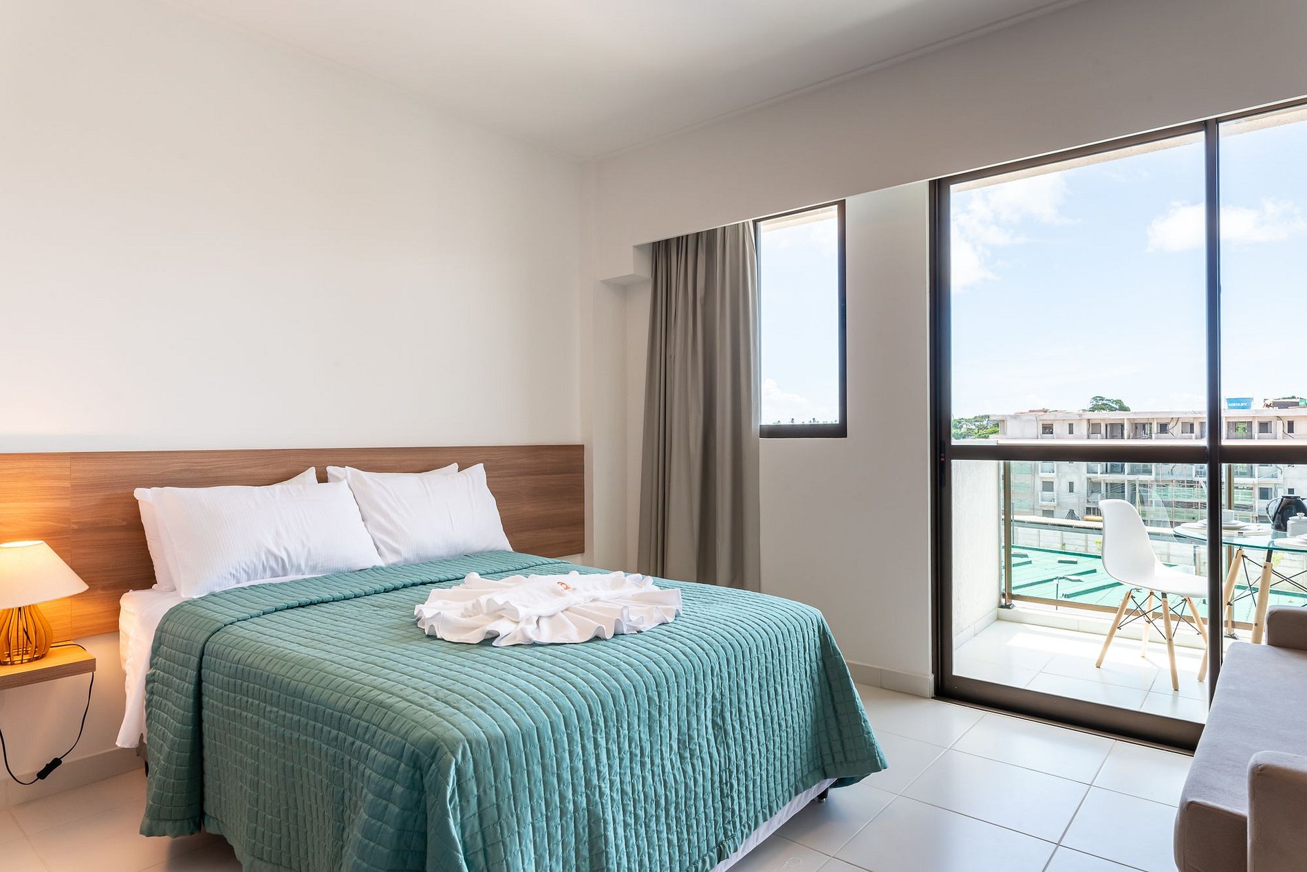 O apartamento tem 26m2, uma suíte completa com Smart TV 50", Arcondicionado 19mil Btus, Geladeira, Fogão Elétrico 2 bocas, Forno Microondas, Cama Casal mais sofá cama casal.