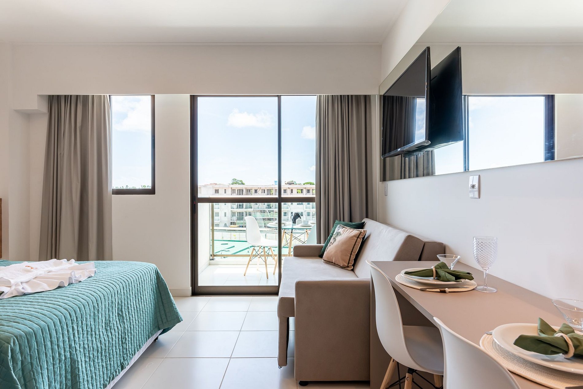 O apartamento tem 26m2, uma suíte completa com Smart TV 50", Arcondicionado 19mil Btus, Geladeira, Fogão Elétrico 2 bocas, Forno Microondas, Cama Casal mais sofá cama casal.