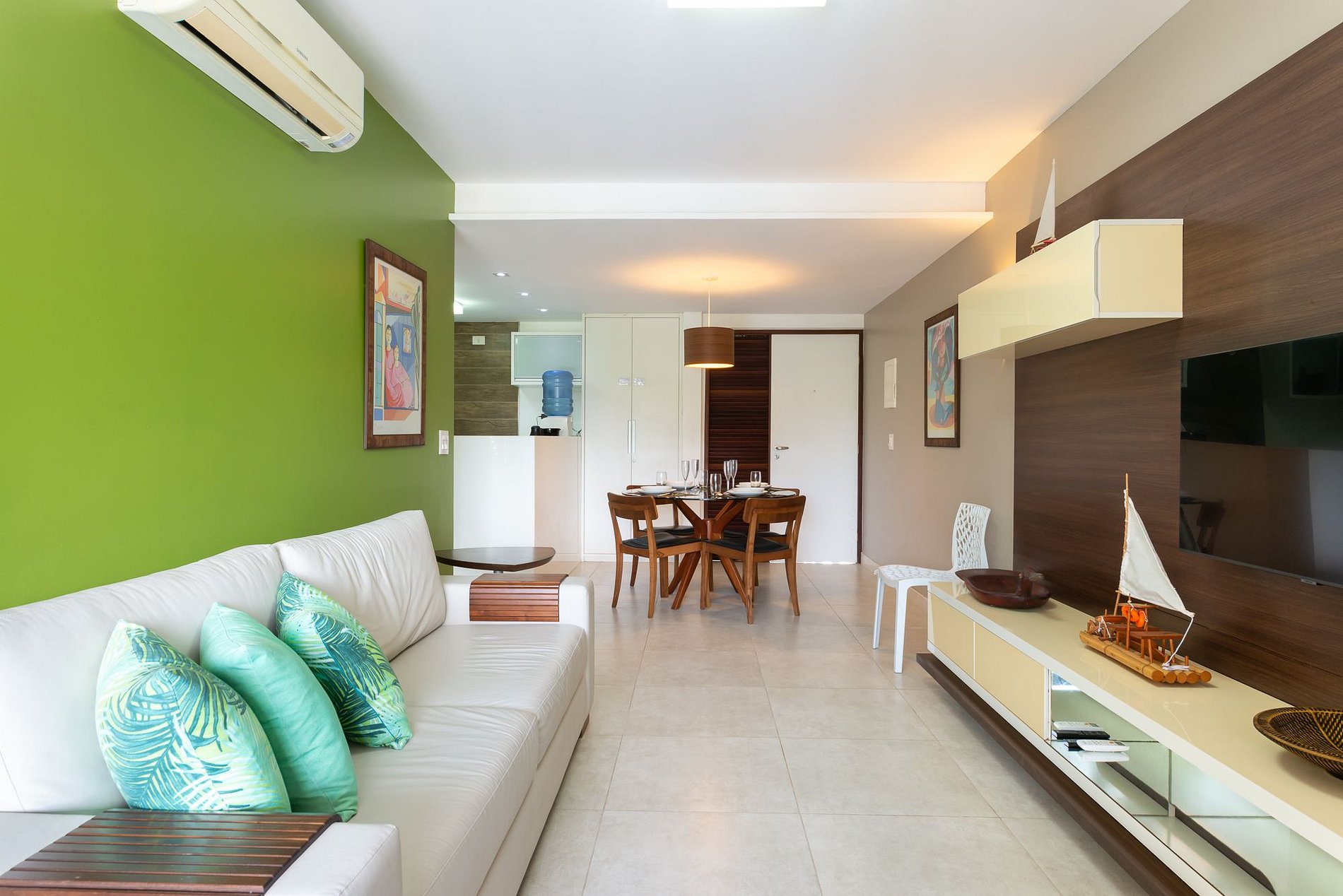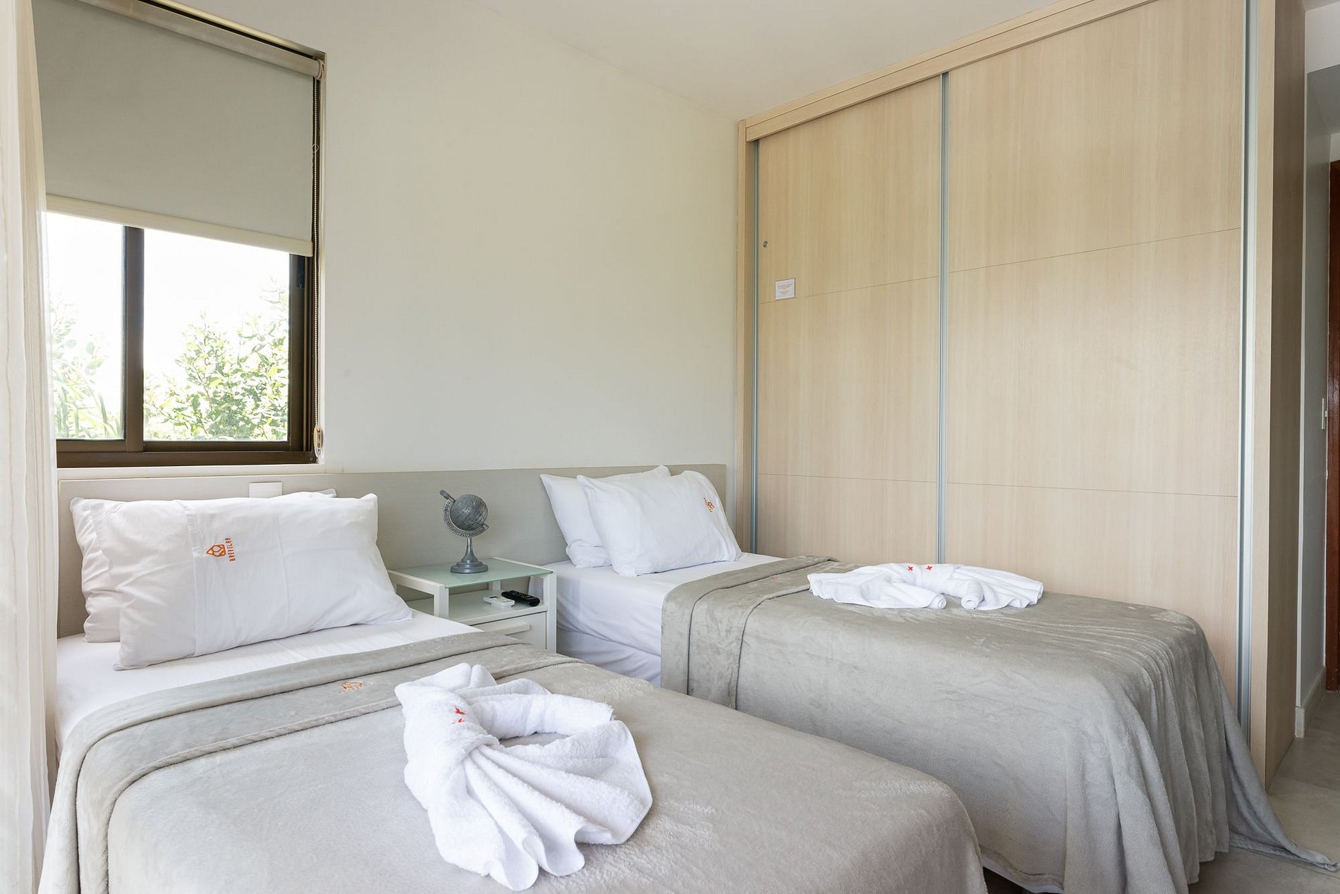 Nesse apartamento de 80m2 hospede-se em uma unidade perfeita para família ou amigos, acomodando até 5 pessoas, com bastante espaço, linda decoração e com estrutura de resort de encher os olhos. Com dois quartos, sendo 1 suíte com cama Queen, e outro quarto com 2 camas solteiro, ar-condicionado, guarda-roupas, e varanda. Conte ainda com mais 1 sala com sofá, TV e ar-condicionado.