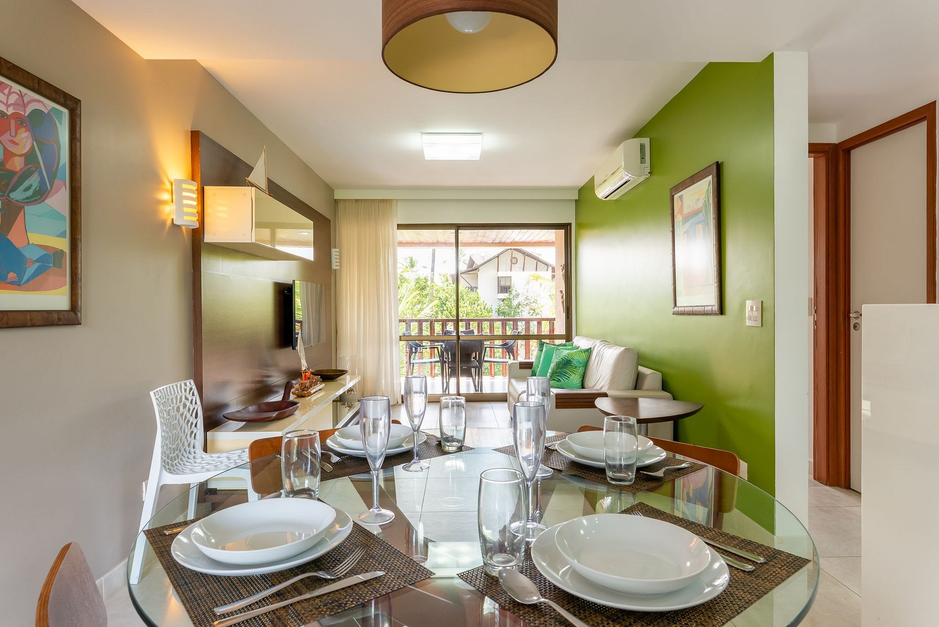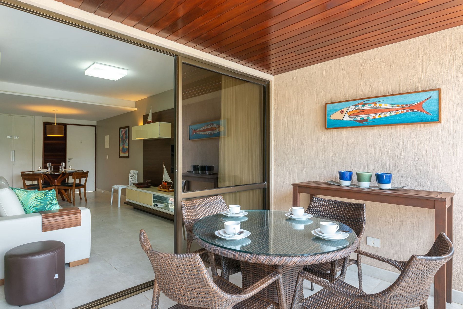 No mais, você vai encontrar 1 banheiro social, mesa para jantar, sala de estar com TV, sofá e cadeiras, varanda com mesas, cadeiras. Na cozinha você tem tudo que precisa: geladeira, micro-ondas, fogão, forno, jogo de prato, talheres, copos, xícaras, taças, e panelas, abridor de vinho, gelágua e sanduicheira.