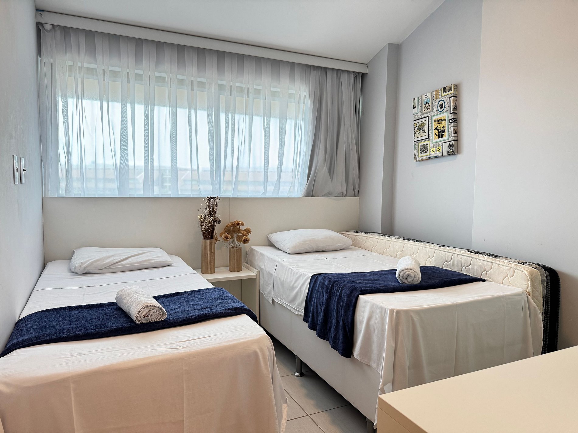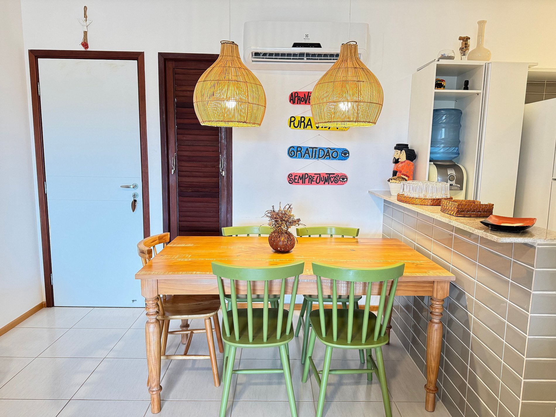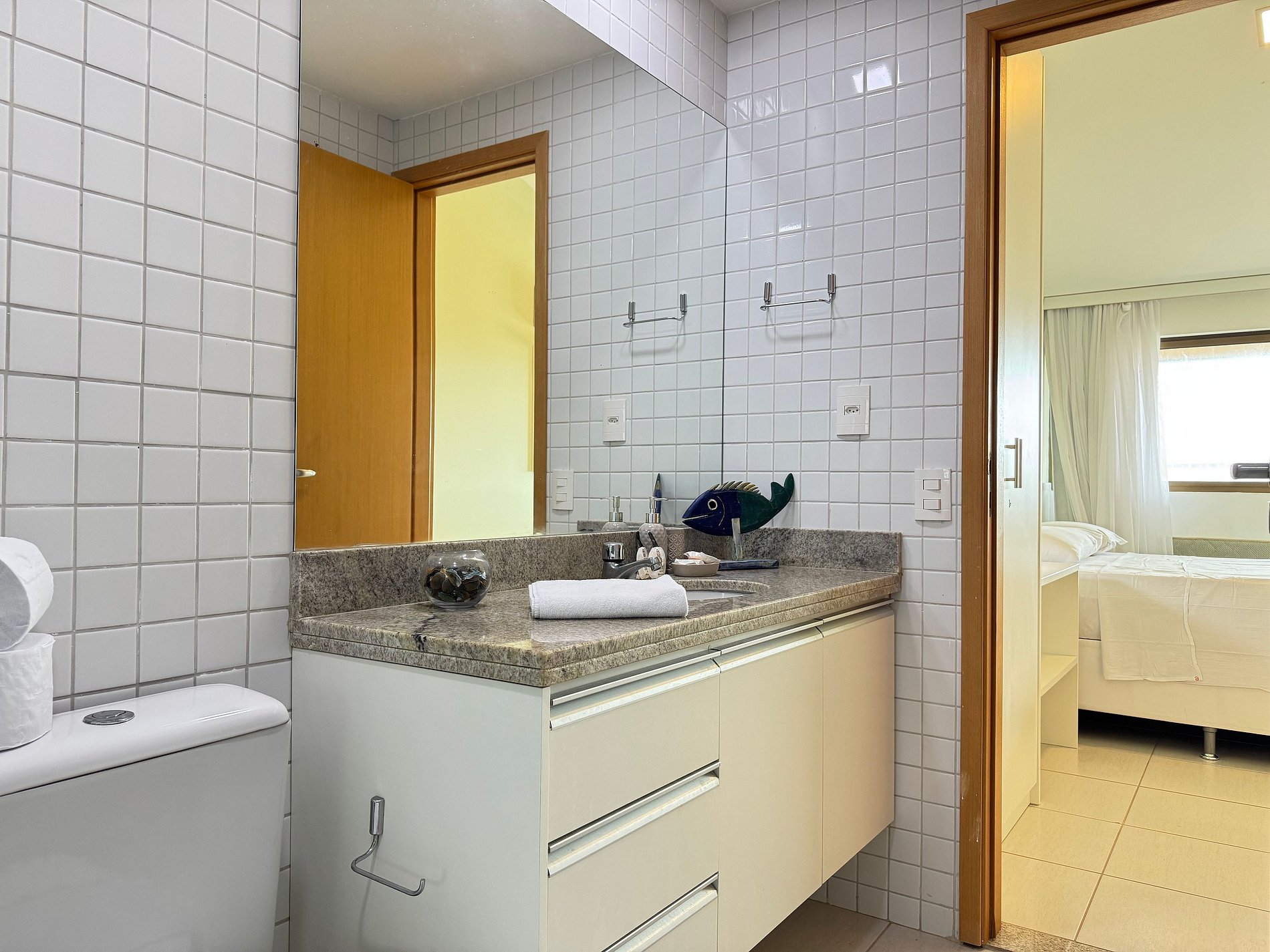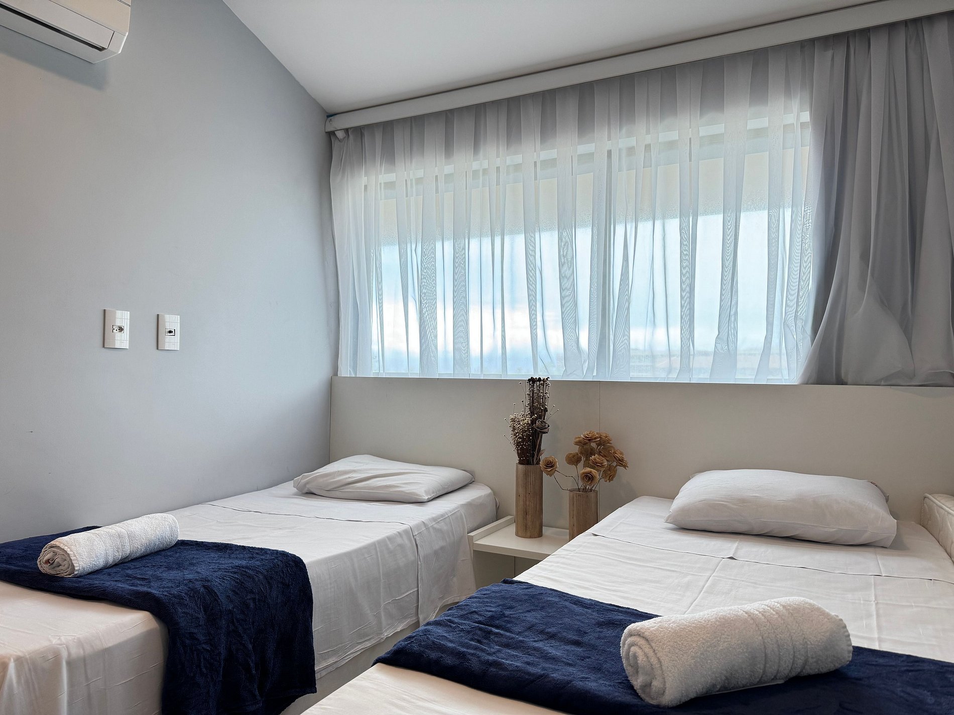 O apartamento tem dois quartos sendo uma suíte, um WC Social, uma sala ampla com dois ambientes, cozinha compacta e uma varanda com vista para as piscinas. O quarto suíte tem 1 cama casal, no quarto social tem 2 camas solteiros e 2 colchões Extras, na sala tem sofá, mesa para 4 lugares e a cozinha completa com fogão, geladeira, micro-ondas, liquidificador, sanduicheira, gelágua e demais utensílios básicos. A varanda tem 1 mesa 4 lugares e uma bela vista para as piscinas.