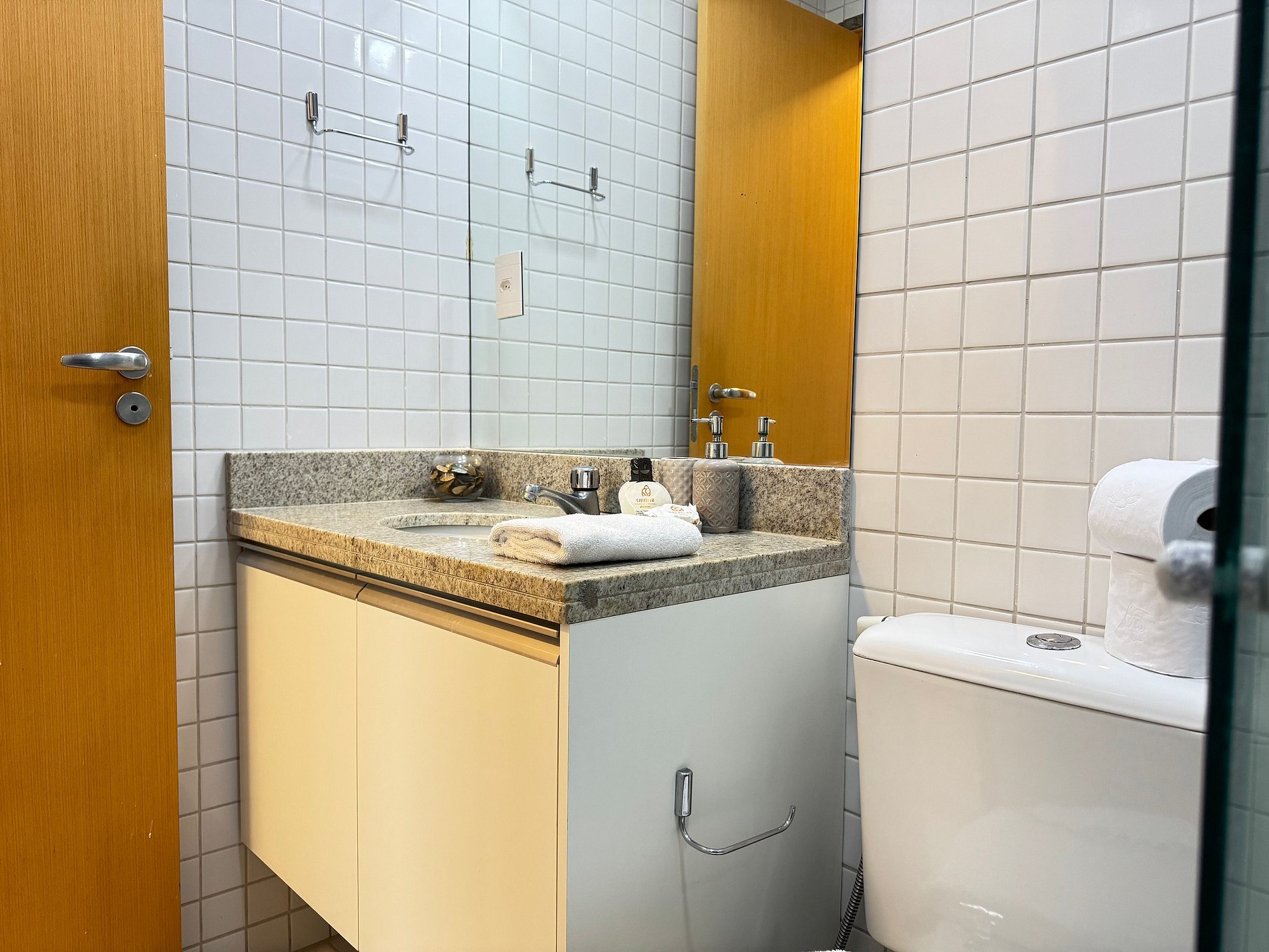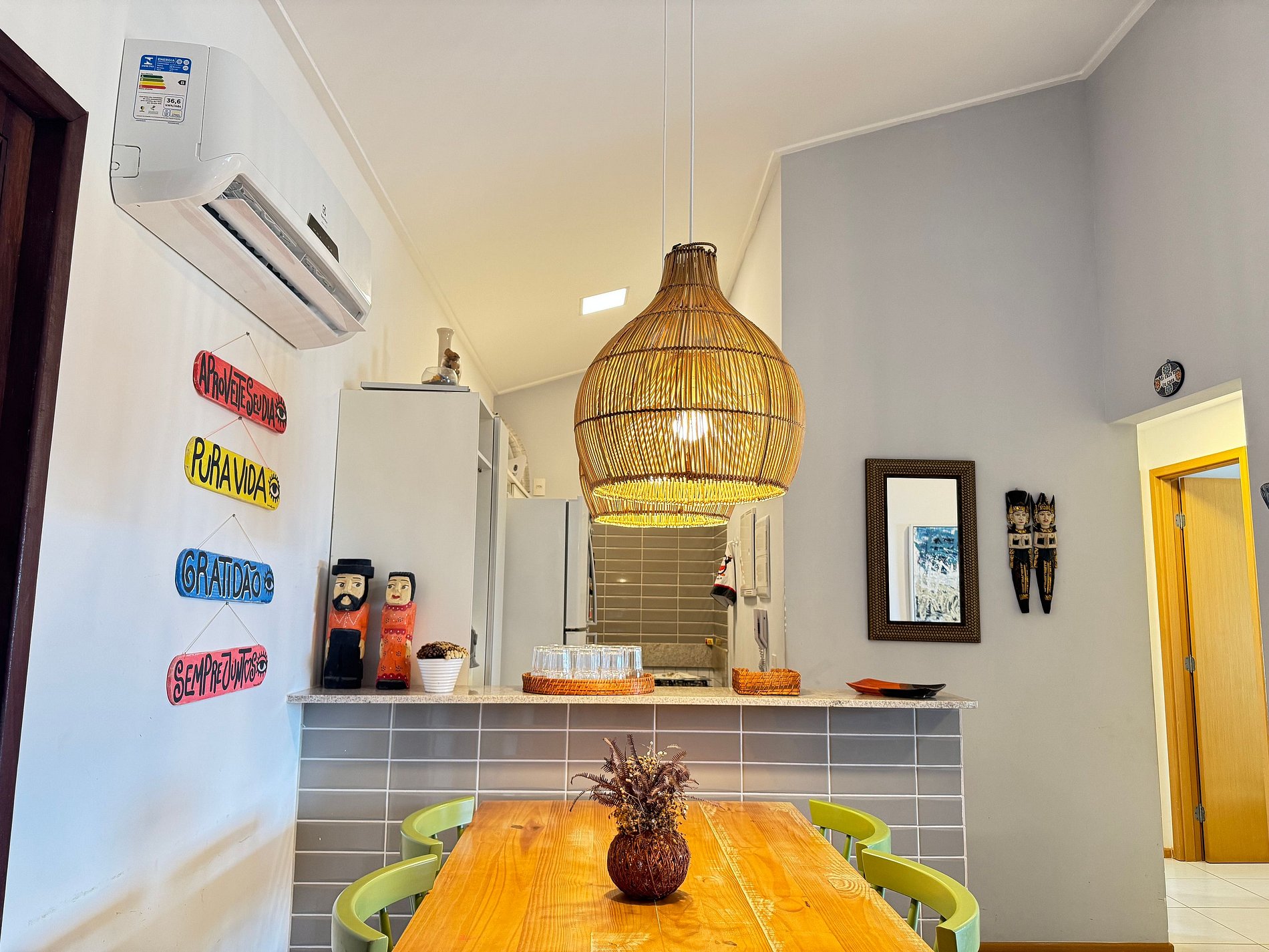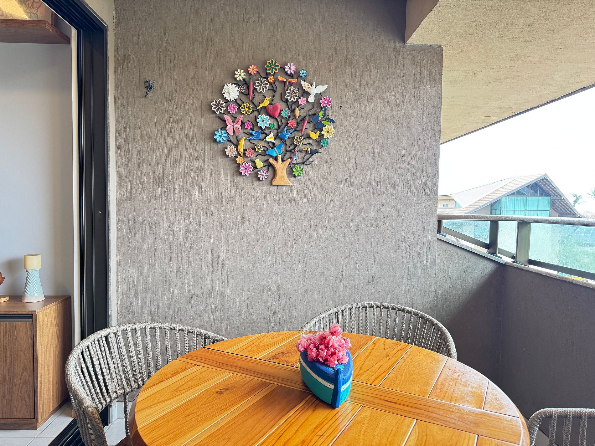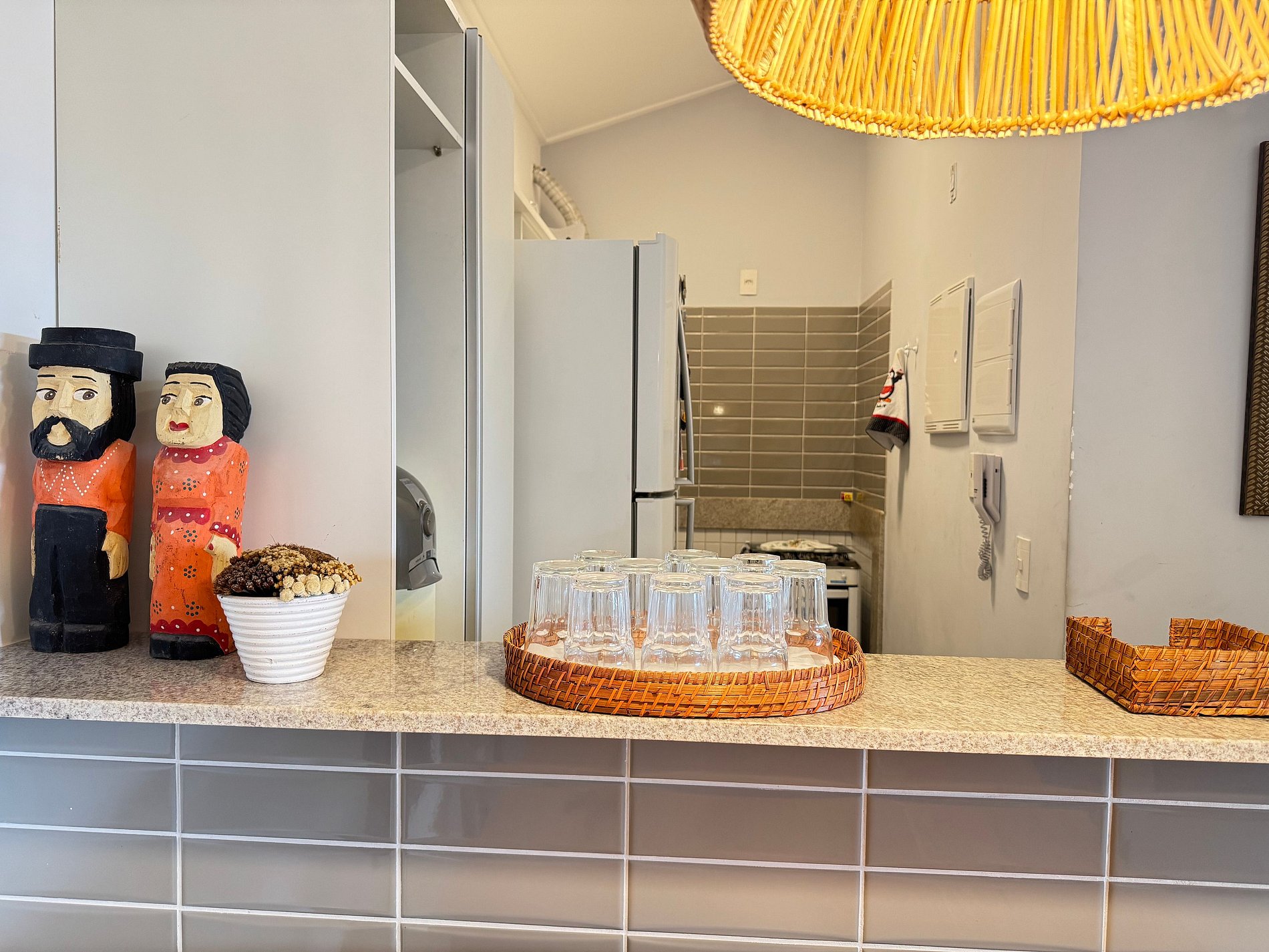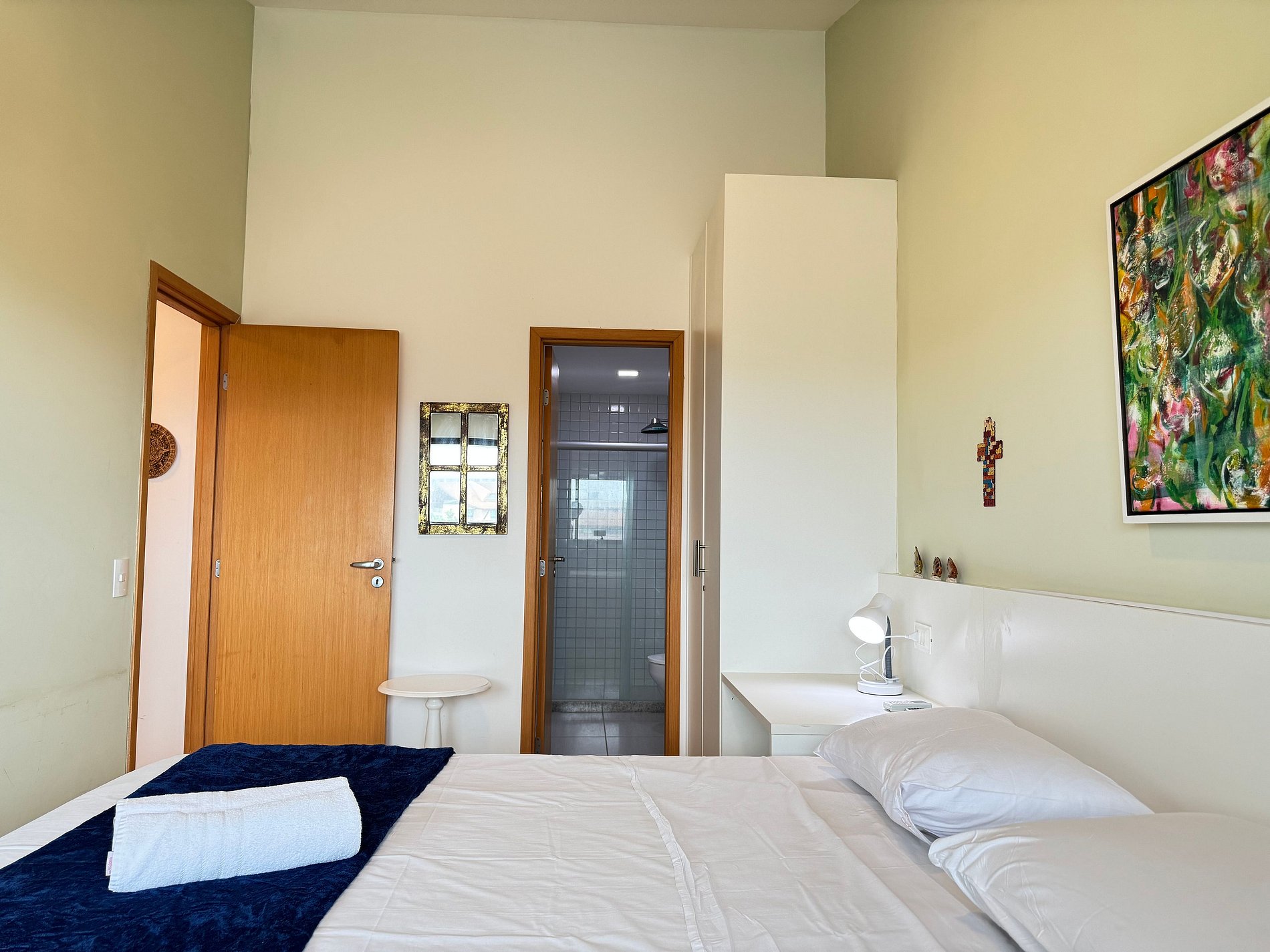 O apartamento tem dois quartos sendo uma suíte, um WC Social, uma sala ampla com dois ambientes, cozinha compacta e uma varanda com vista para as piscinas. O quarto suíte tem 1 cama casal, no quarto social tem 2 camas solteiros e 2 colchões Extras, na sala tem sofá, mesa para 4 lugares e a cozinha completa com fogão, geladeira, micro-ondas, liquidificador, sanduicheira, gelágua e demais utensílios básicos. A varanda tem 1 mesa 4 lugares e uma bela vista para as piscinas.