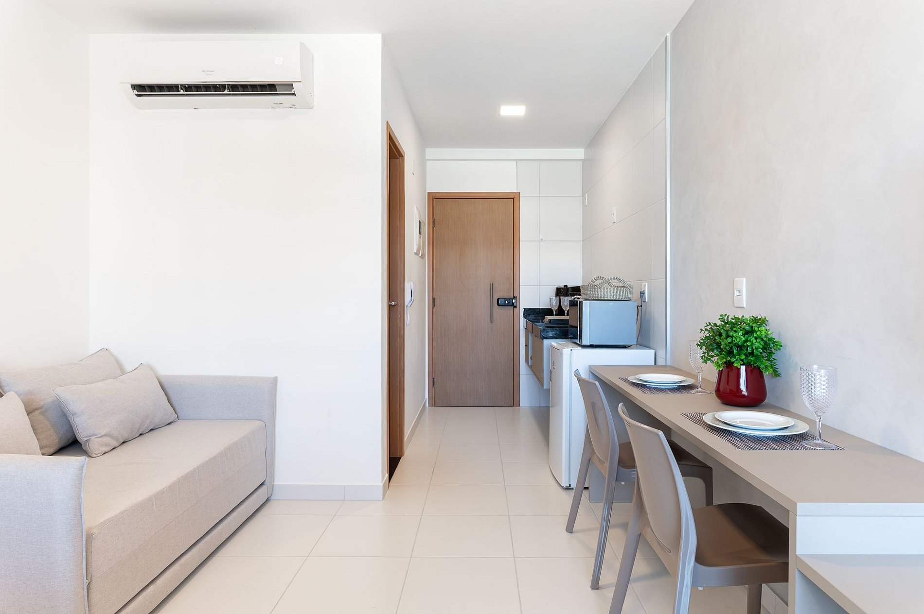 O apartamento tem 26m2, uma suíte completa com Smart TV 50", Arcondicionado 19mil Btus, Frigobar, Fogão Elétrico 2 bocas, Forno Microondas, Cama Casal mais sofá cama casal.
