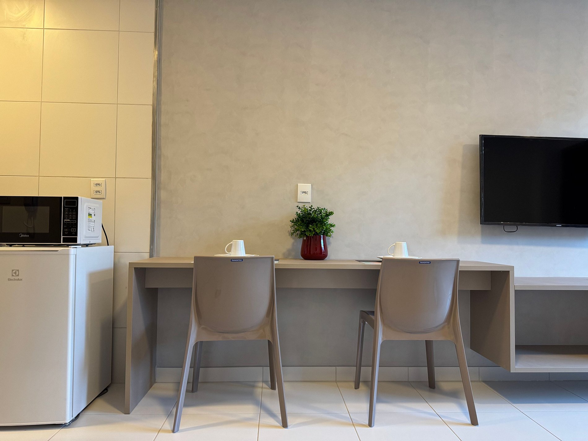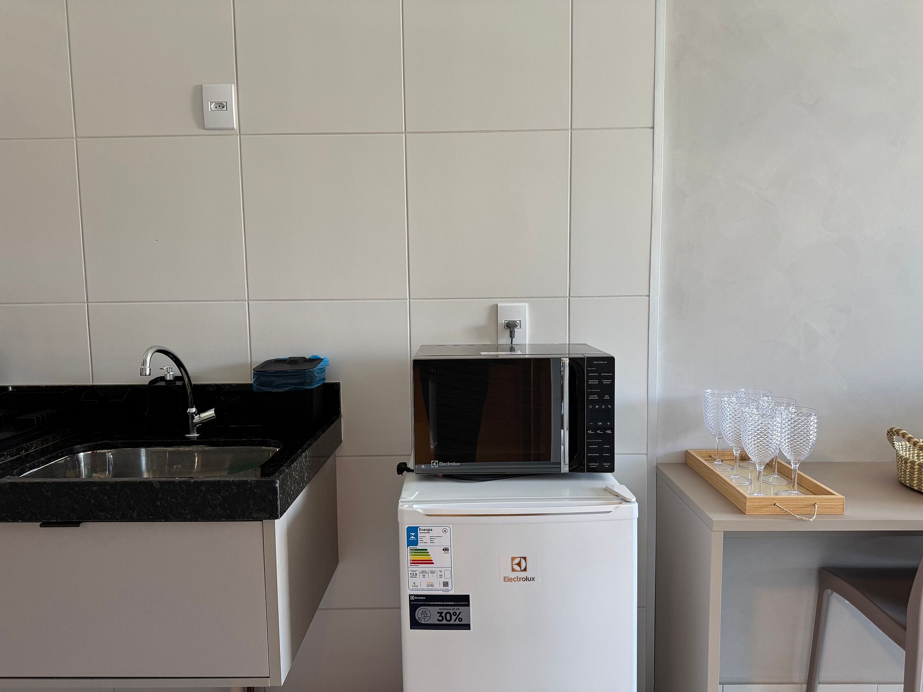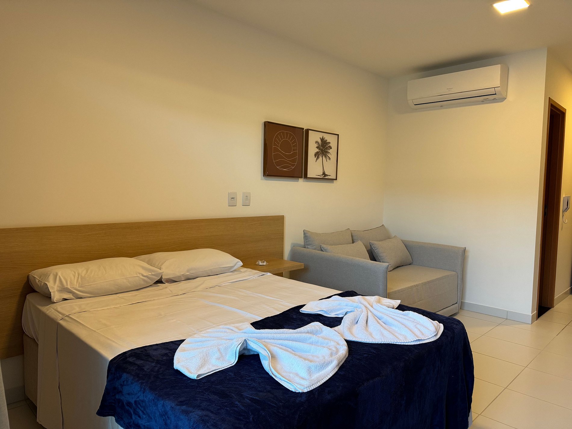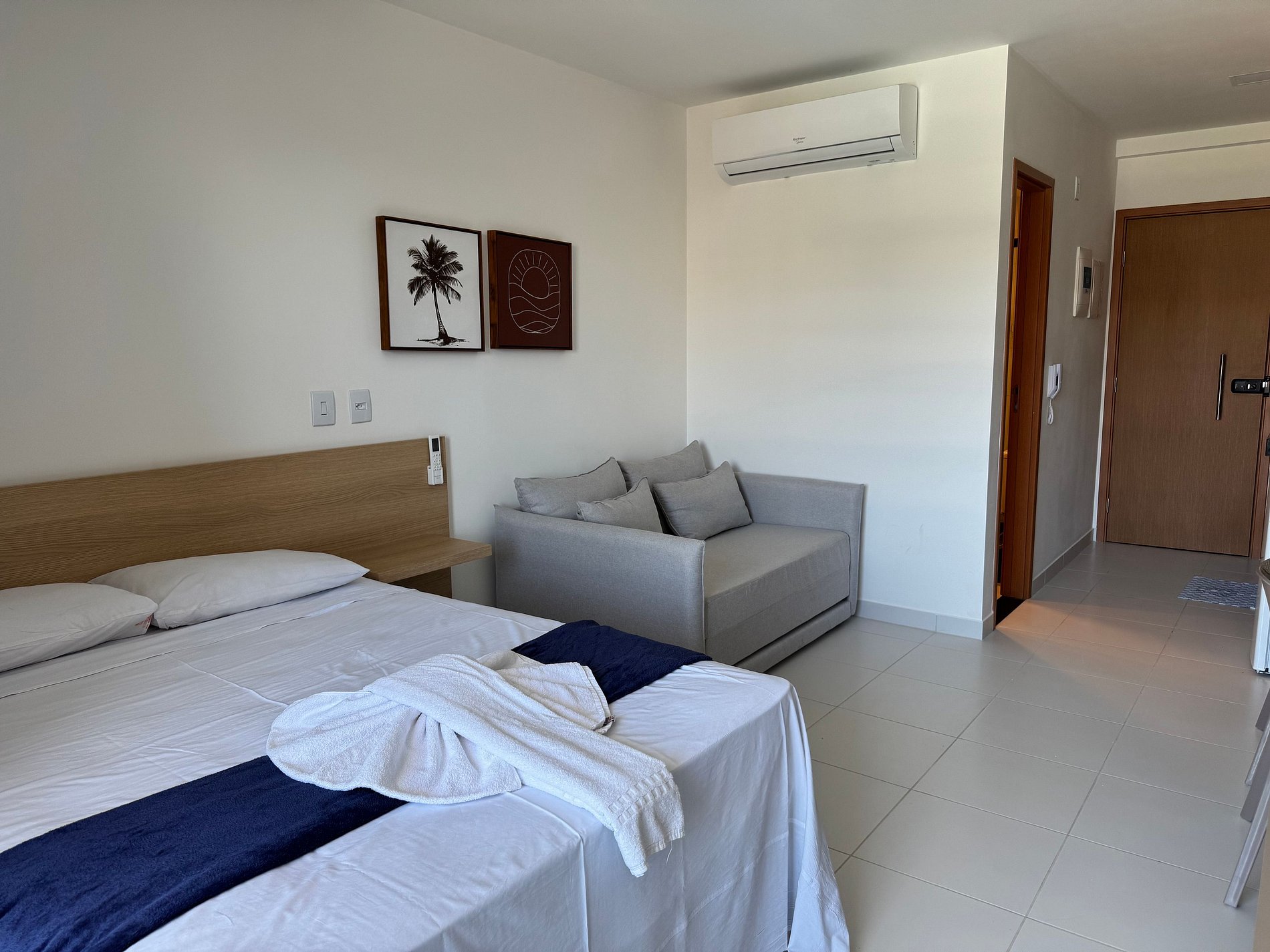 O apartamento tem 26m2, uma suíte completa com Smart TV 50", Arcondicionado 19mil Btus, Frigobar, Fogão Elétrico 2 bocas, Forno Microondas, Cama Casal mais sofá cama casal.