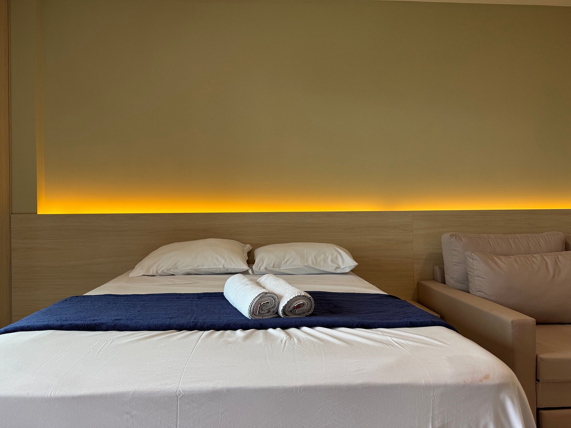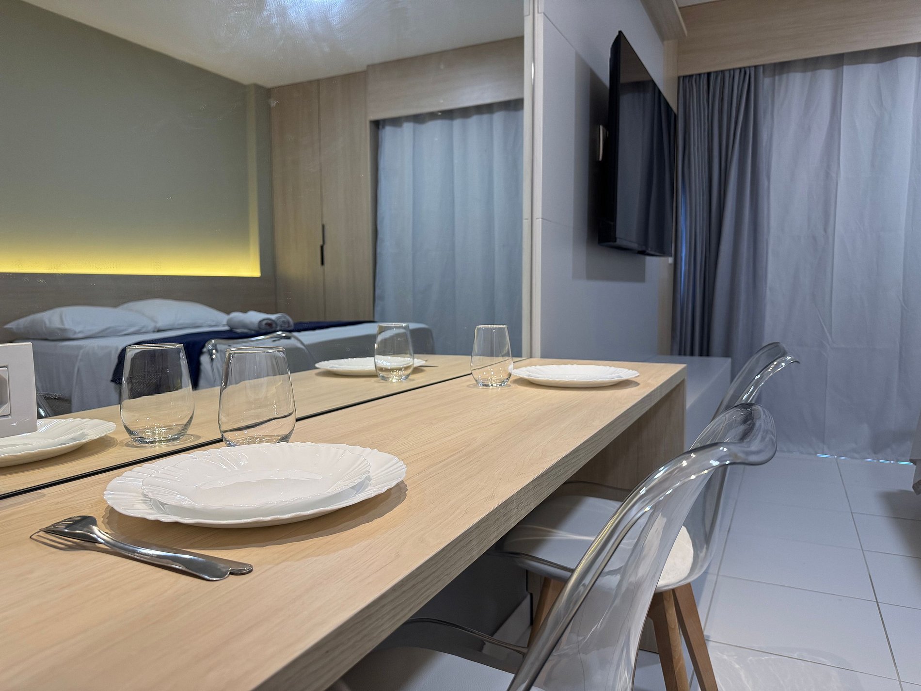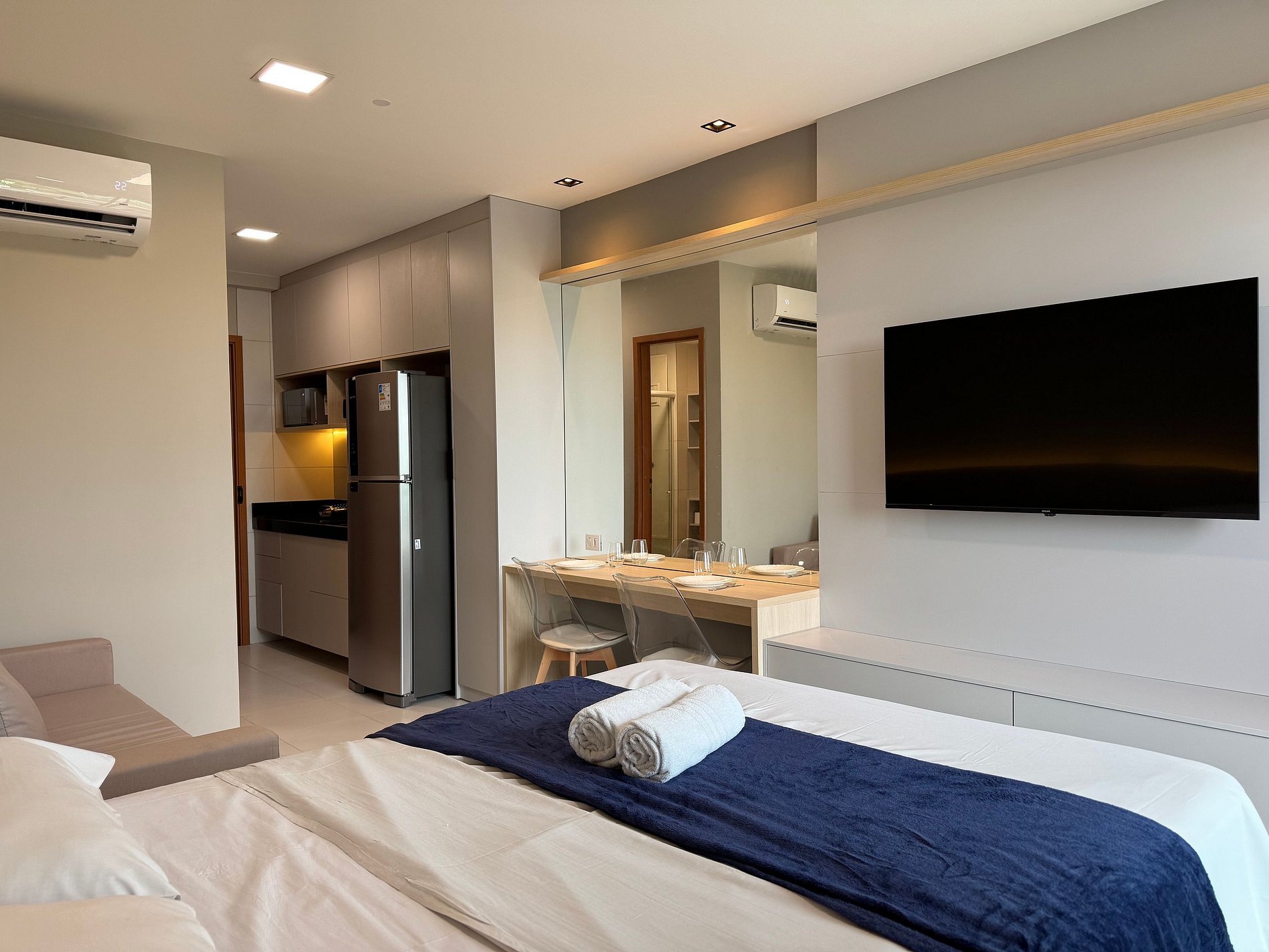 O apartamento tem 26m2, uma suíte completa com Smart TV 50", Arcondicionado 19mil Btus, Frigobar, Fogão Elétrico 2 bocas, Forno Microondas, Cama Casal mais sofá cama casal.