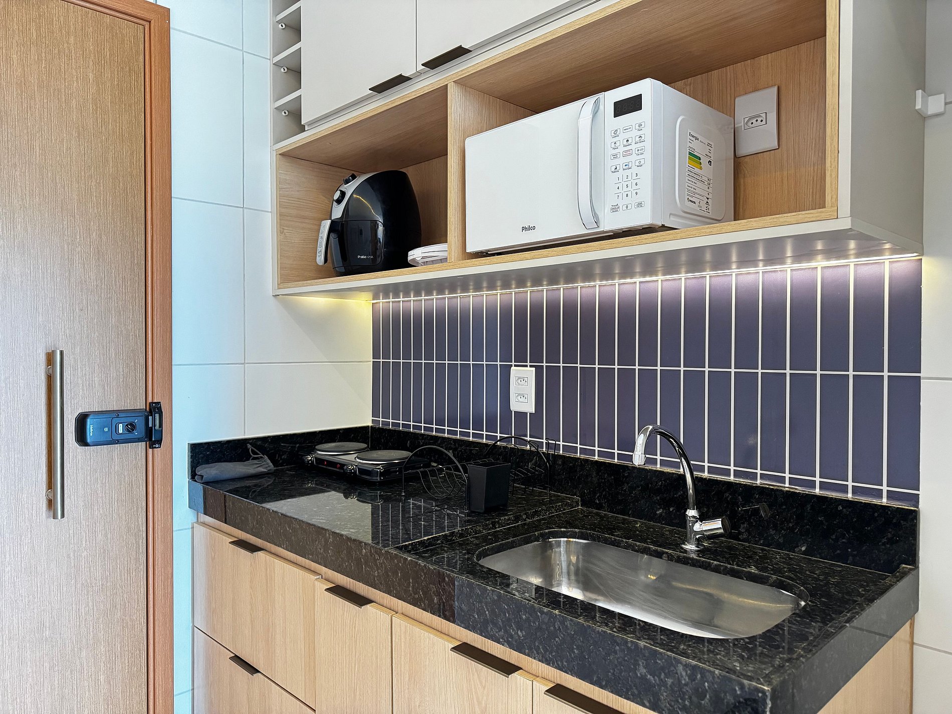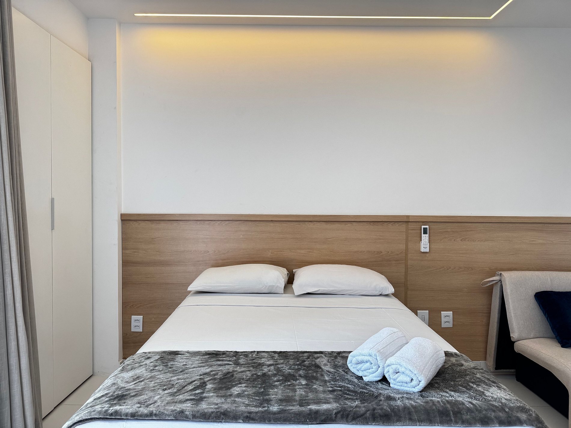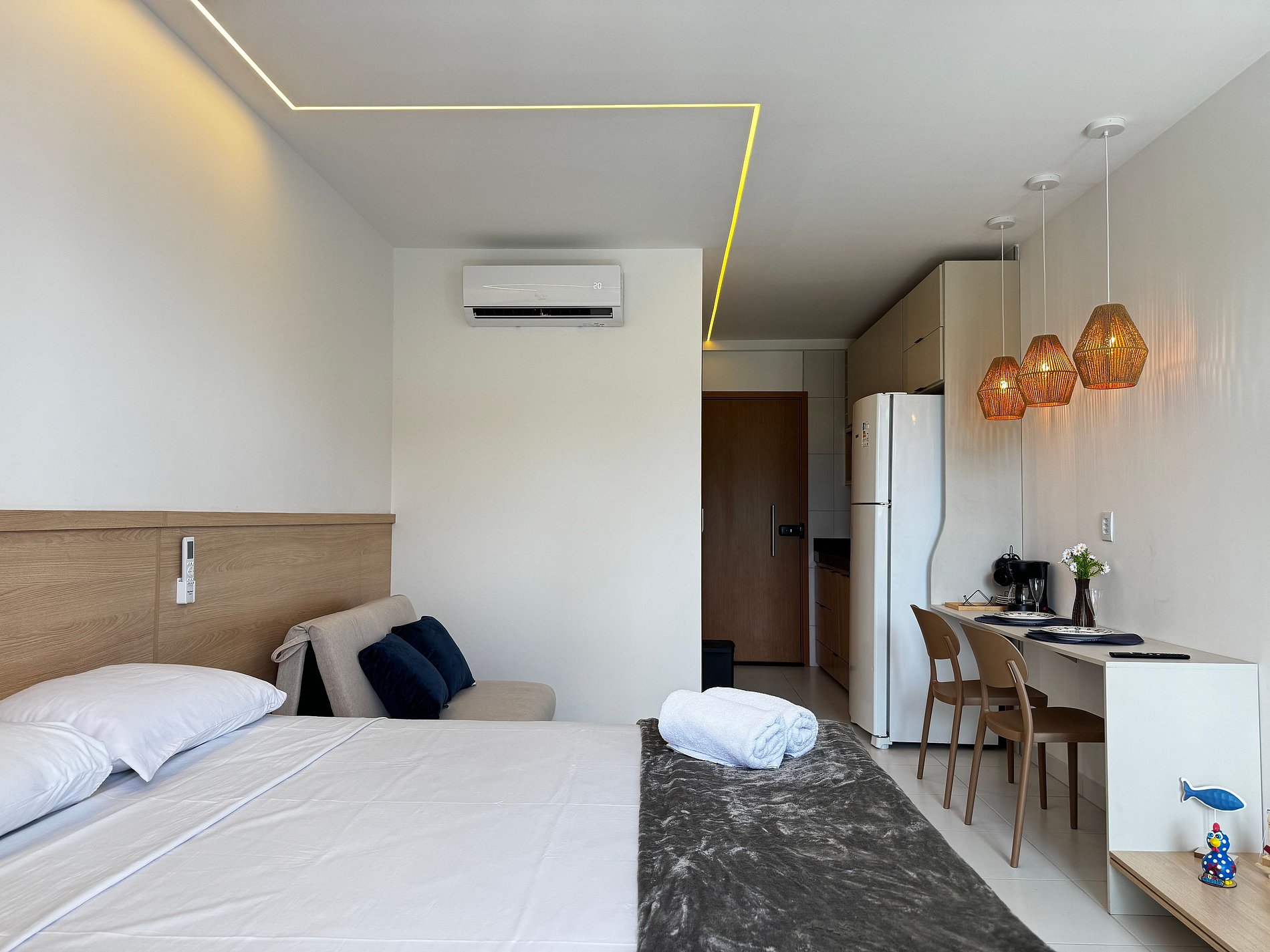 O apartamento possui 26m² e conta com uma suíte completa, Smart TV de 50", ar-condicionado de 19.000 BTUs, frigobar, fogão elétrico de 2 bocas, forno micro-ondas, cama de casal e sofá-cama.