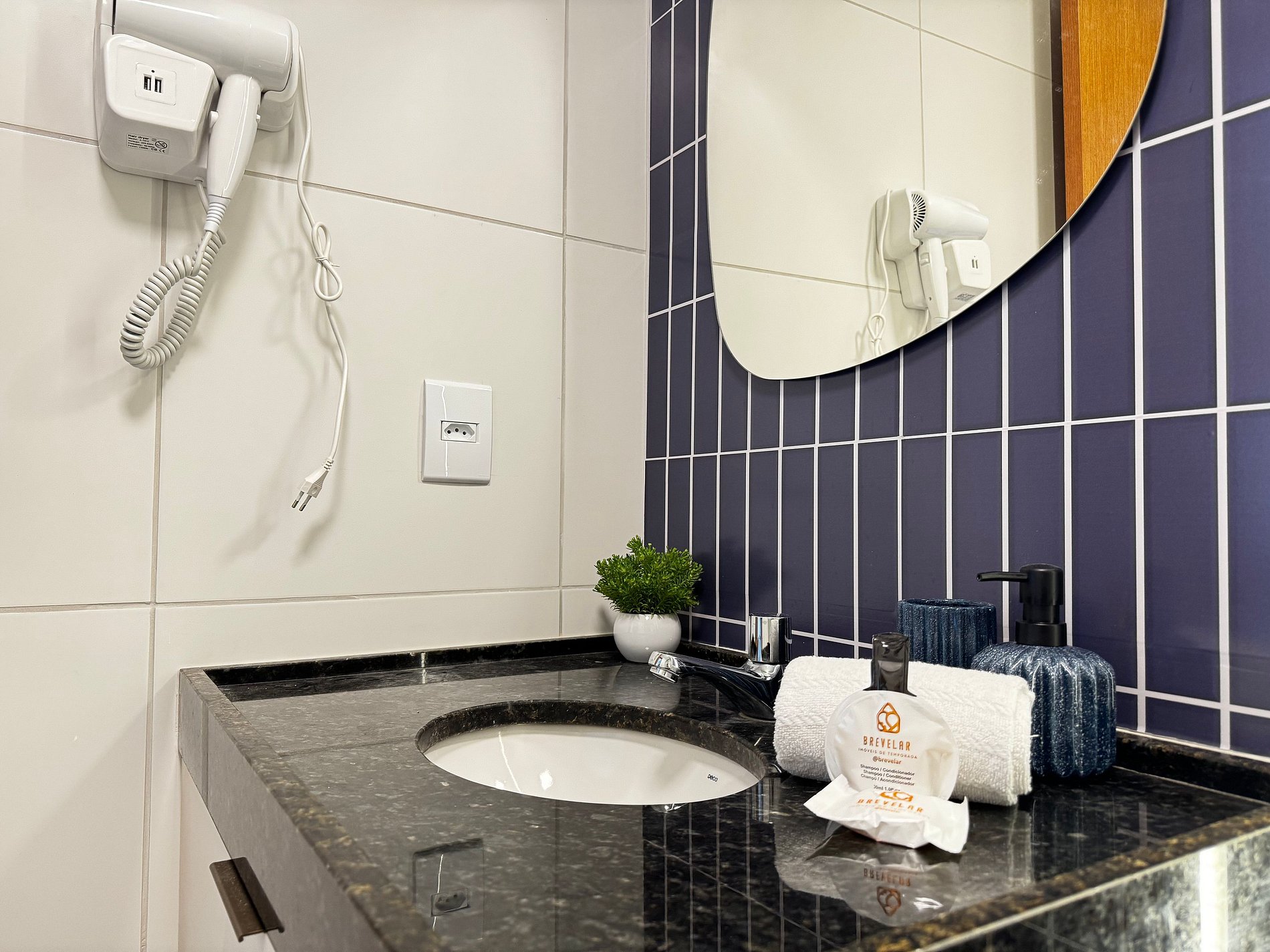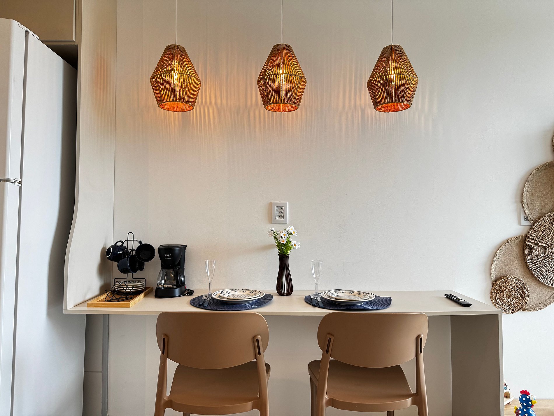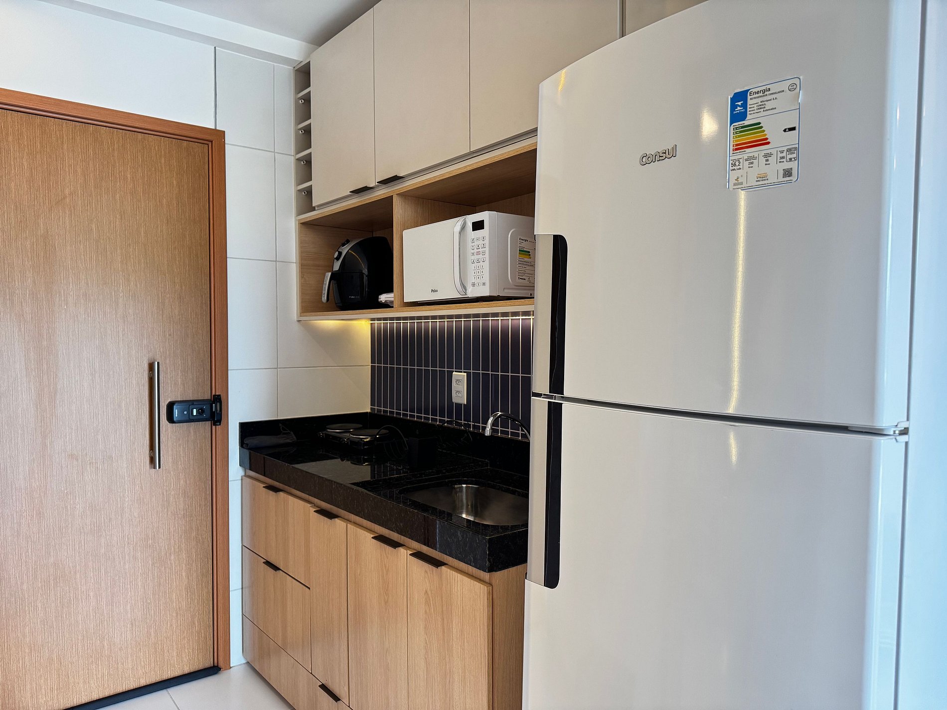 O apartamento possui 26m² e conta com uma suíte completa, Smart TV de 50", ar-condicionado de 19.000 BTUs, frigobar, fogão elétrico de 2 bocas, forno micro-ondas, cama de casal e sofá-cama.