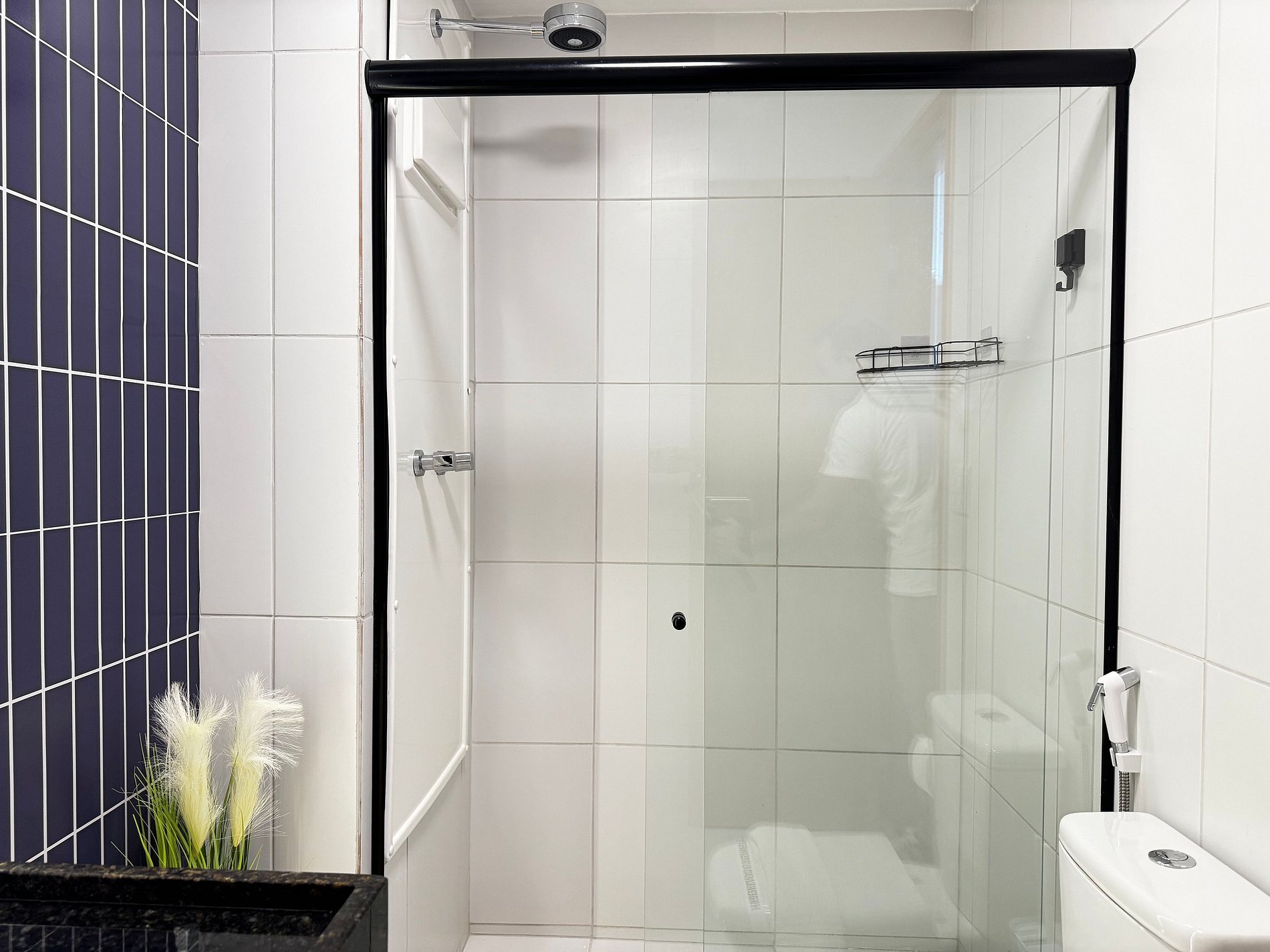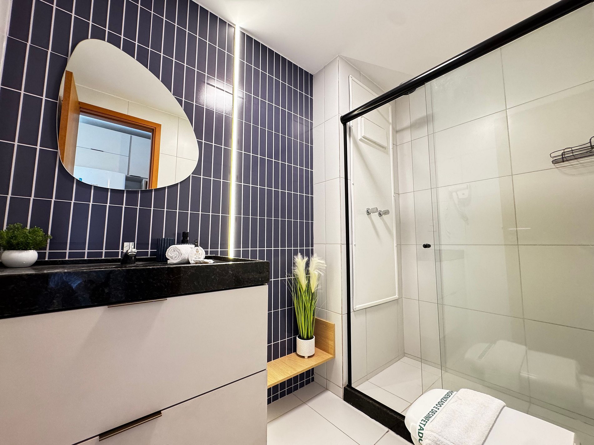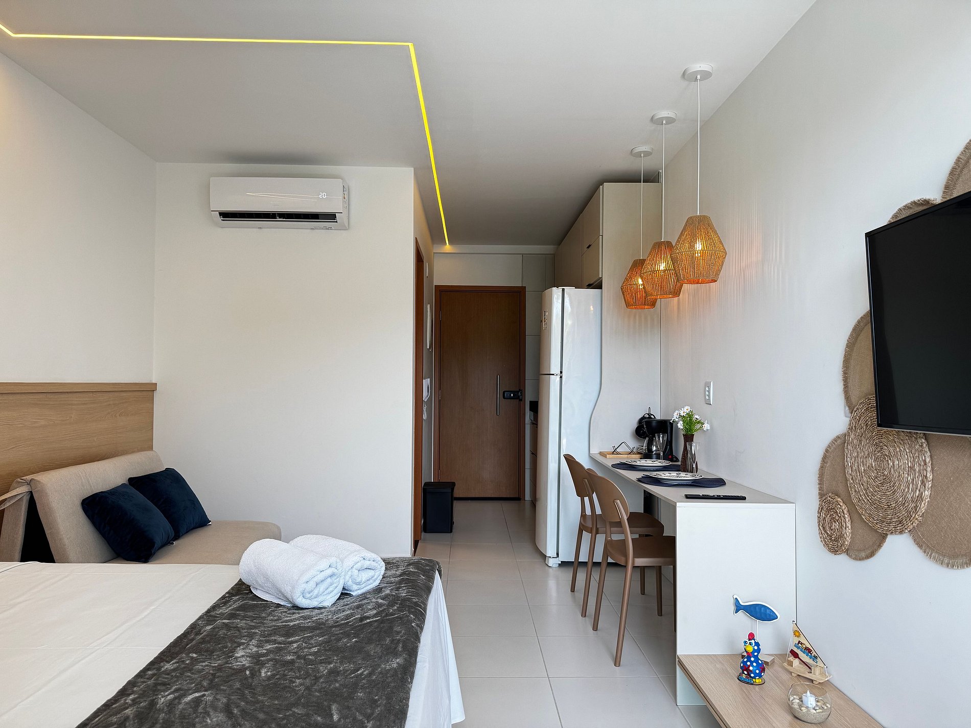 O apartamento possui 26m² e conta com uma suíte completa equipada com Smart TV de 50", ar-condicionado de 19 mil BTUs, frigobar, fogão elétrico de 2 bocas, forno micro-ondas, cama de casal e sofá-cama.