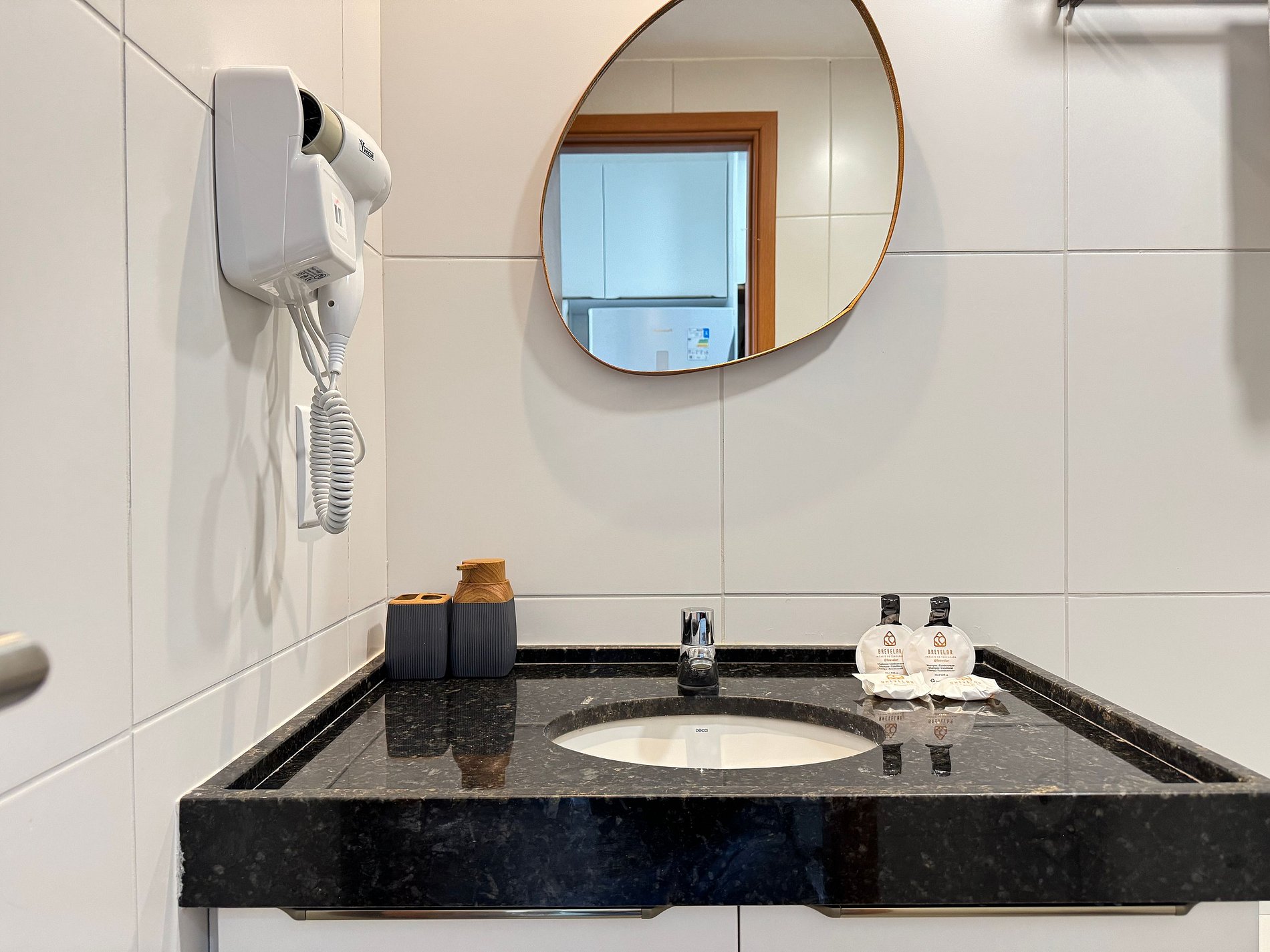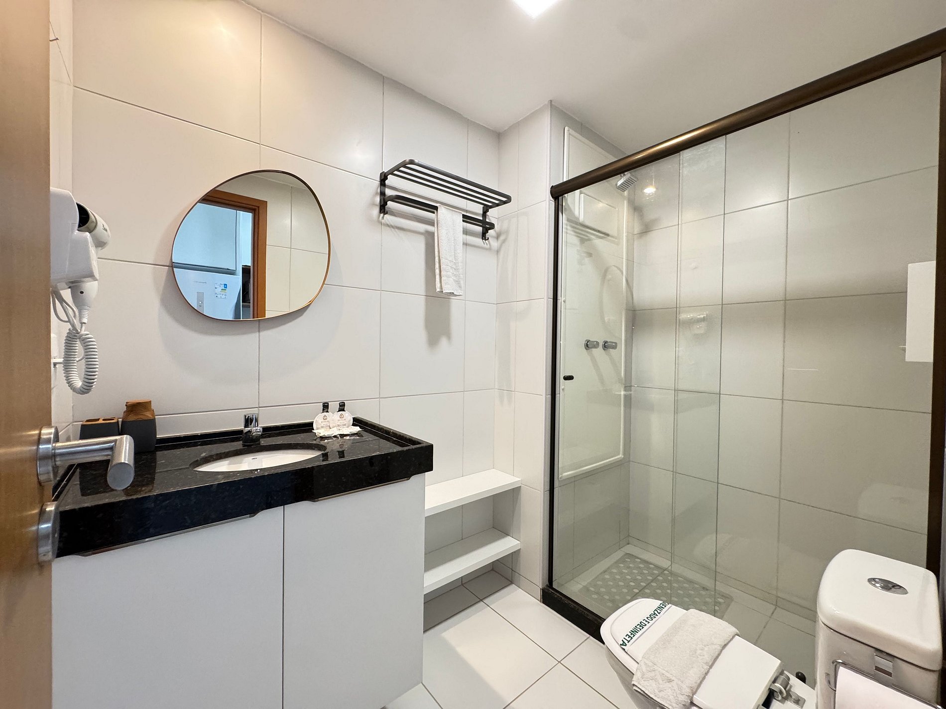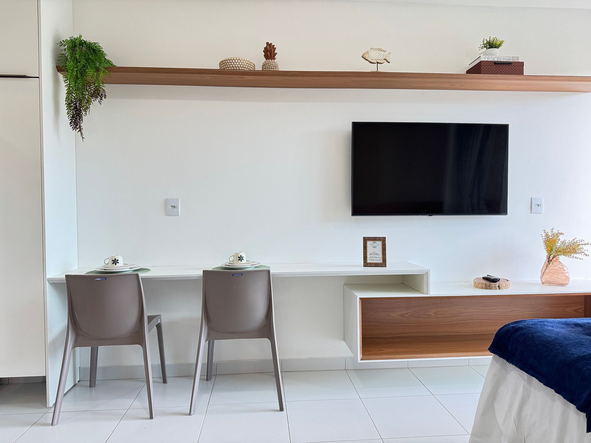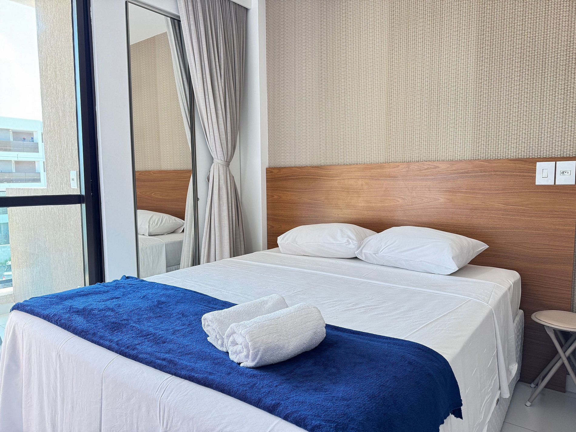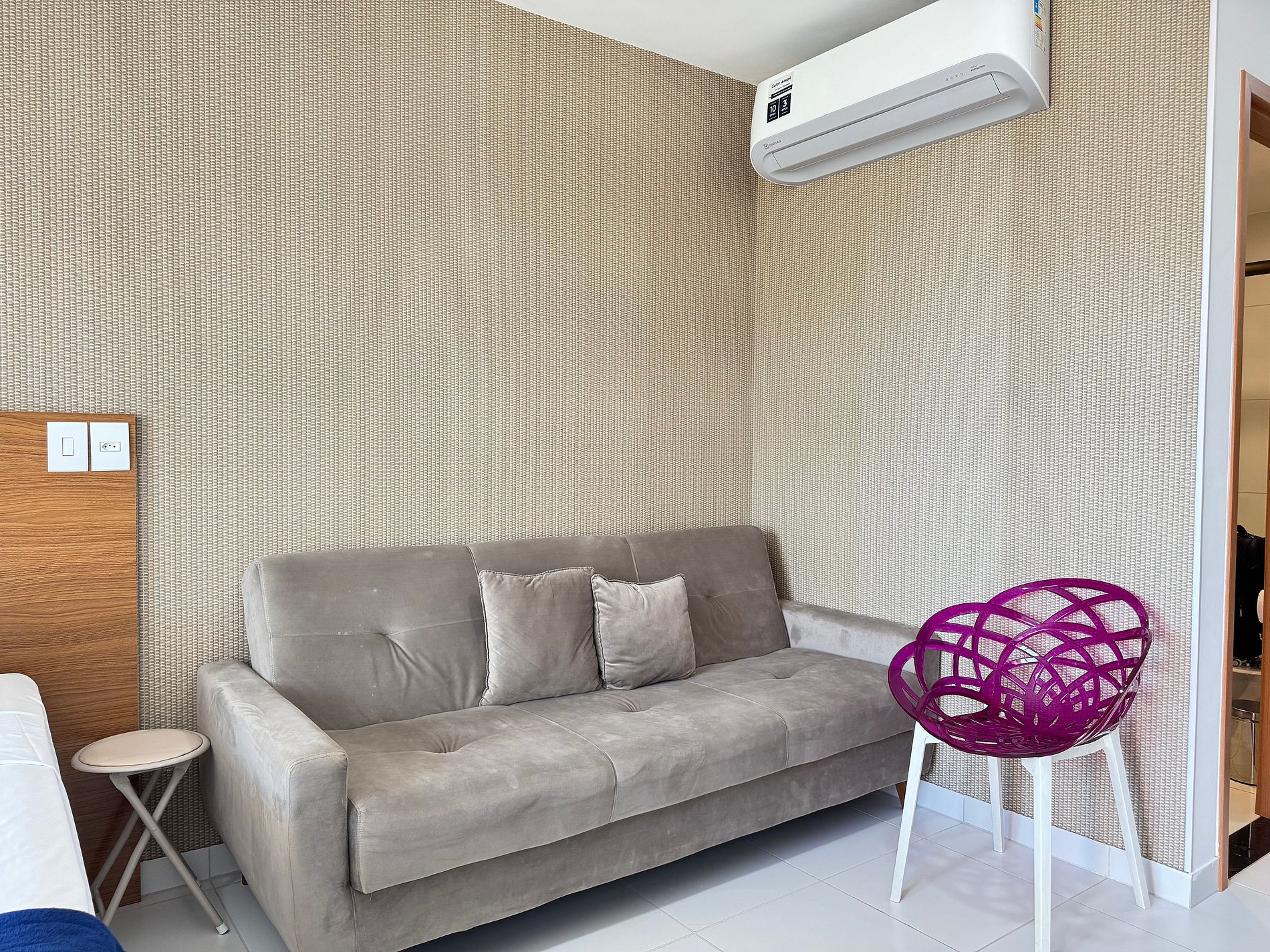 O apartamento tem 26m2, uma suíte completa com Smart TV 50", Arcondicionado 19mil Btus, Geladeira, Fogão Indução 2 bocas, Forno Microondas, Cama Casal mais sofá cama casal.