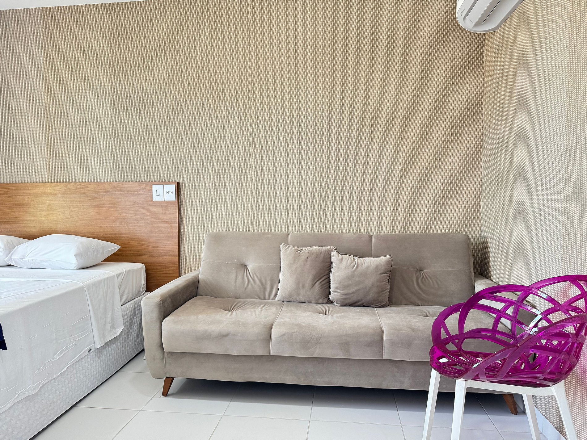 O apartamento tem 26m2, uma suíte completa com Smart TV 50", Arcondicionado 19mil Btus, Geladeira, Fogão Indução 2 bocas, Forno Microondas, Cama Casal mais sofá cama casal.