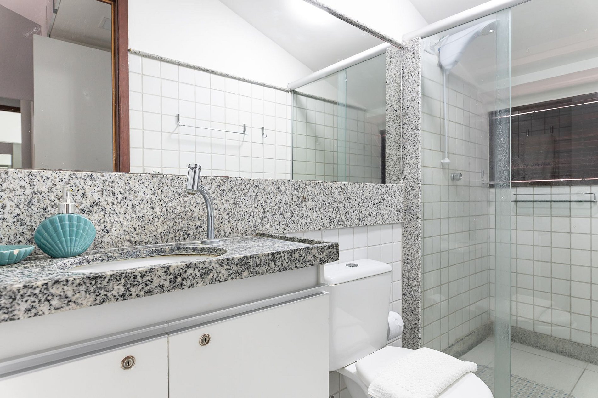 No mais, você vai encontrar 2 banheiros, mesa para jantar, sala de estar com TV, sofá e cadeiras, varanda com mesas, cadeiras. Na cozinha você tem tudo que precisa: geladeira, micro-ondas, fogão, forno, jogo de prato, talheres, copos, xícaras, taças, e panelas, abridor de vinho, gelágua e sanduicheira.