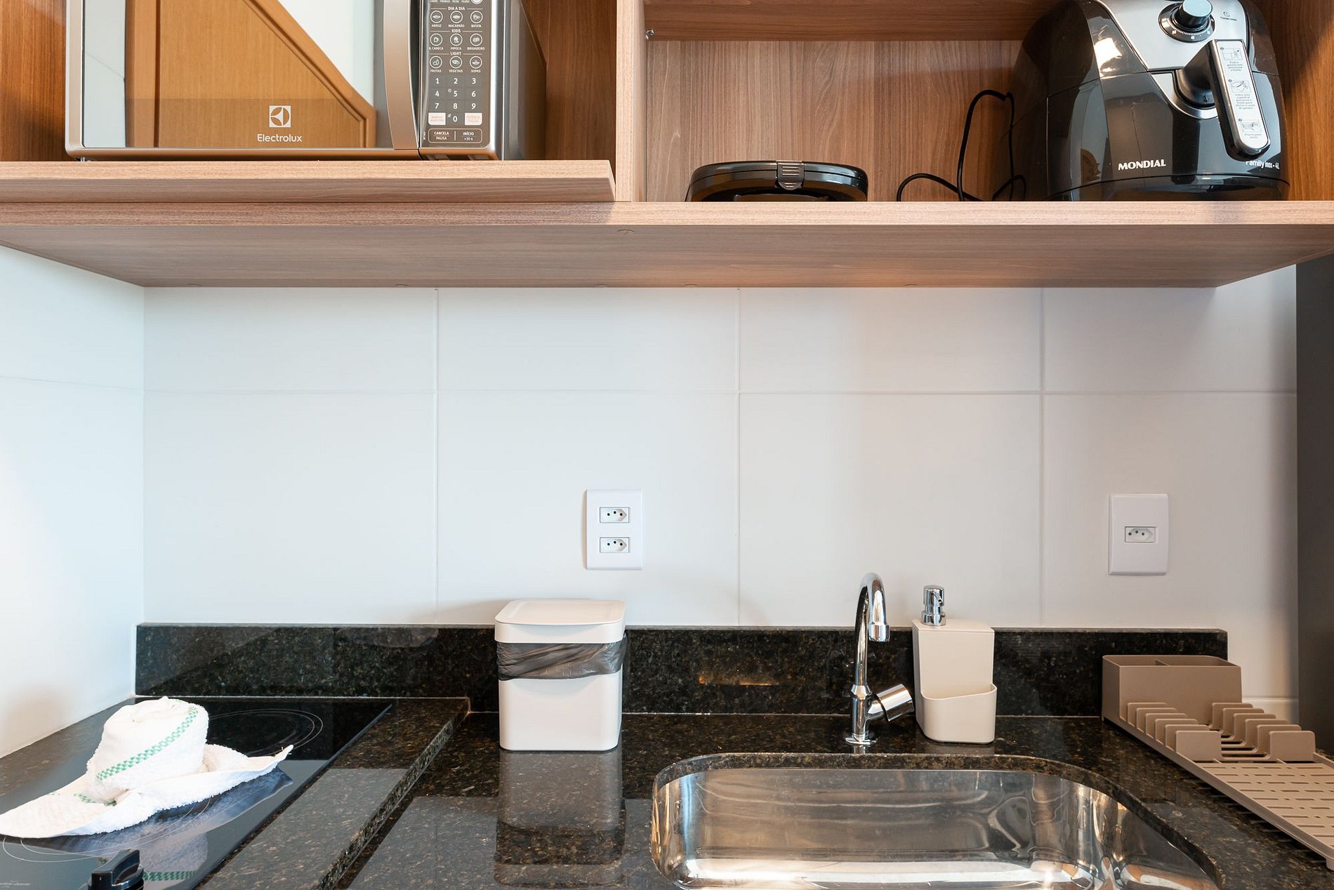 O apartamento térreo frente para piscina tem 26m2, uma suíte completa com Smart TV 50", Arcondicionado 19mil Btus, Geladeira, Fogão Elétrico 2 bocas, Forno Microondas, Cama Casal mais sofá cama casal.