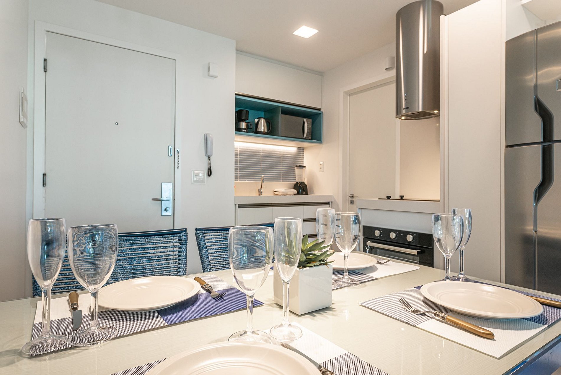 Totalmente equipado com toda infraestrutura de casa, como ferro de passar, fogão elétrico de duas bocas, forno elétrico de 46L, microondas, geladeira, sanduicheira, liquidificador, cafeteira e demais acessórios (pratos, copos, taças, xícaras, talheres, jogo de panelas (assadores, cuscuzeira, panelas, leiteira, forma de bolo e travessas).