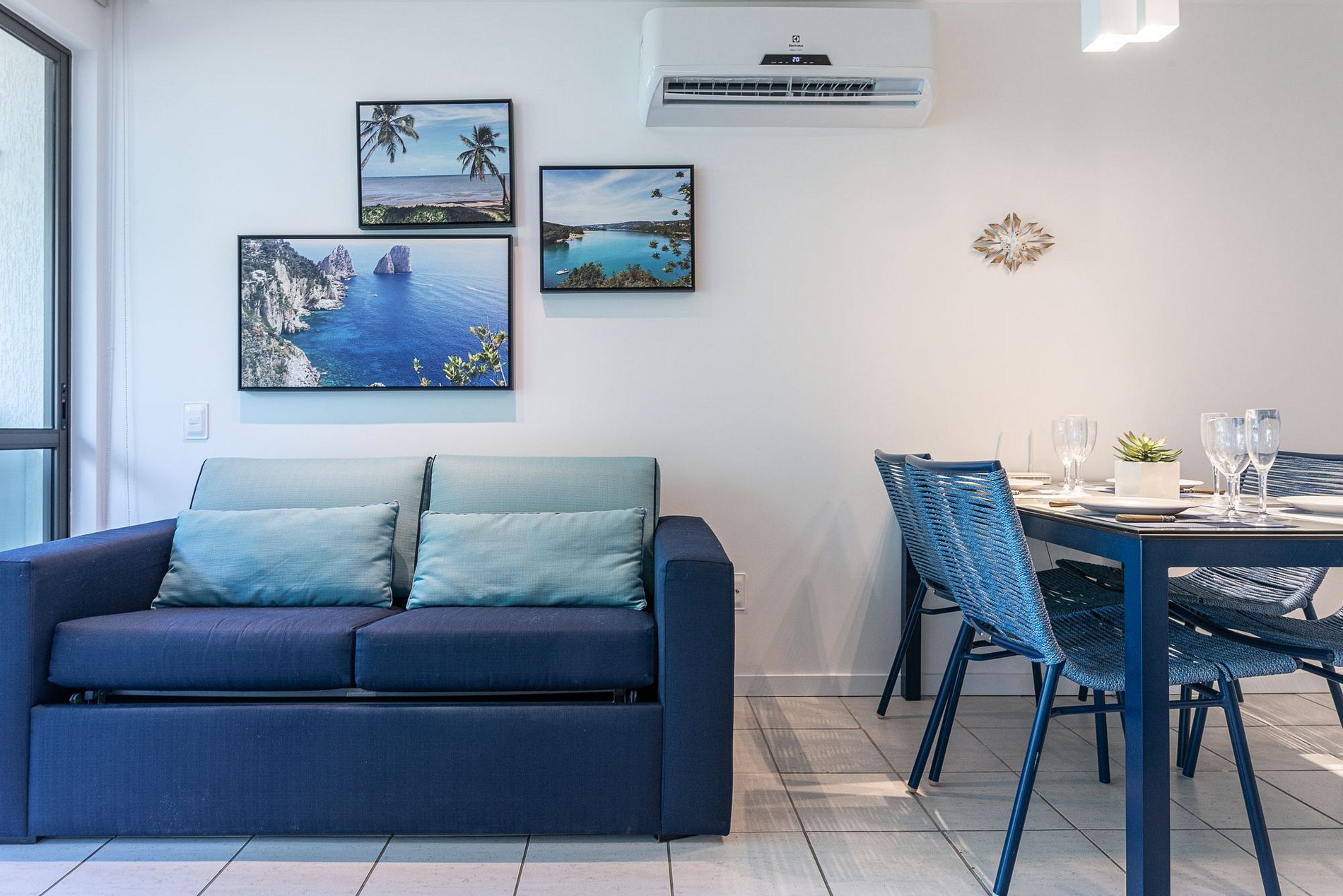 O nosso Flat tem 45m2 foi reformado com um padrão bem luxuoso totalmente no NanoGlass, localizado no térreo com vista para as piscinas e jardim, com sala e cozinha integrados, 2 (dois) quartos, ambos com cama de casal (temos roupa de cama e toalhas). Na sala há um sofá-cama de casal.