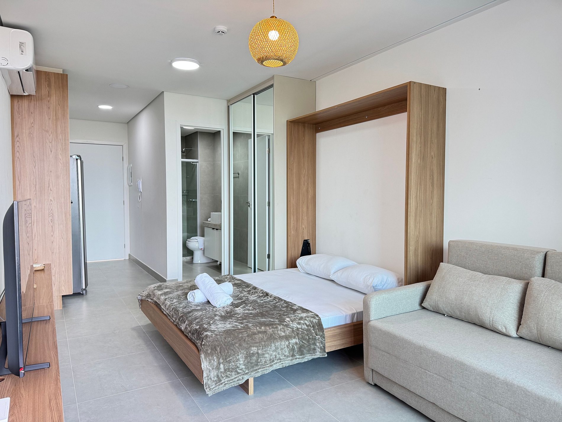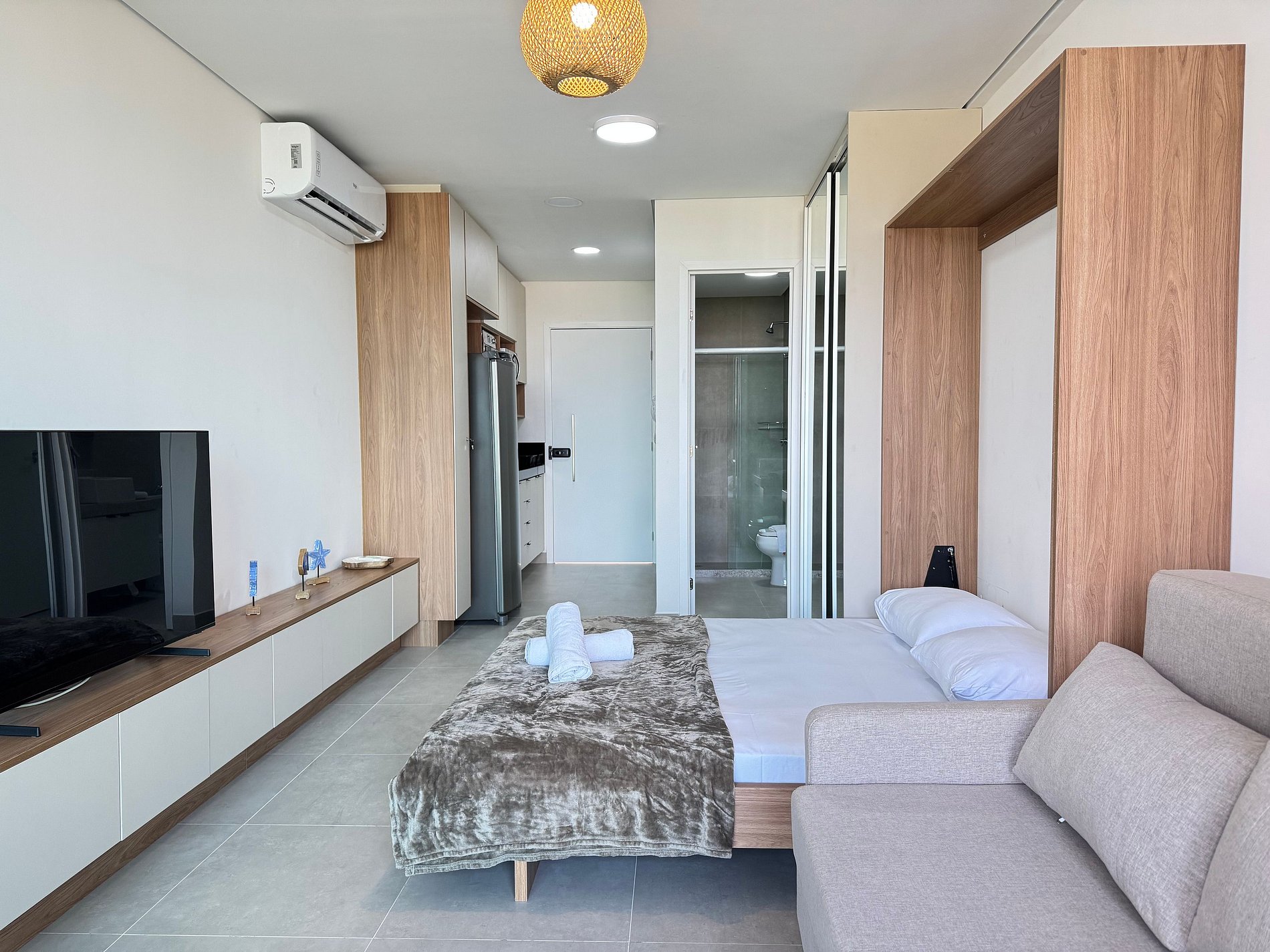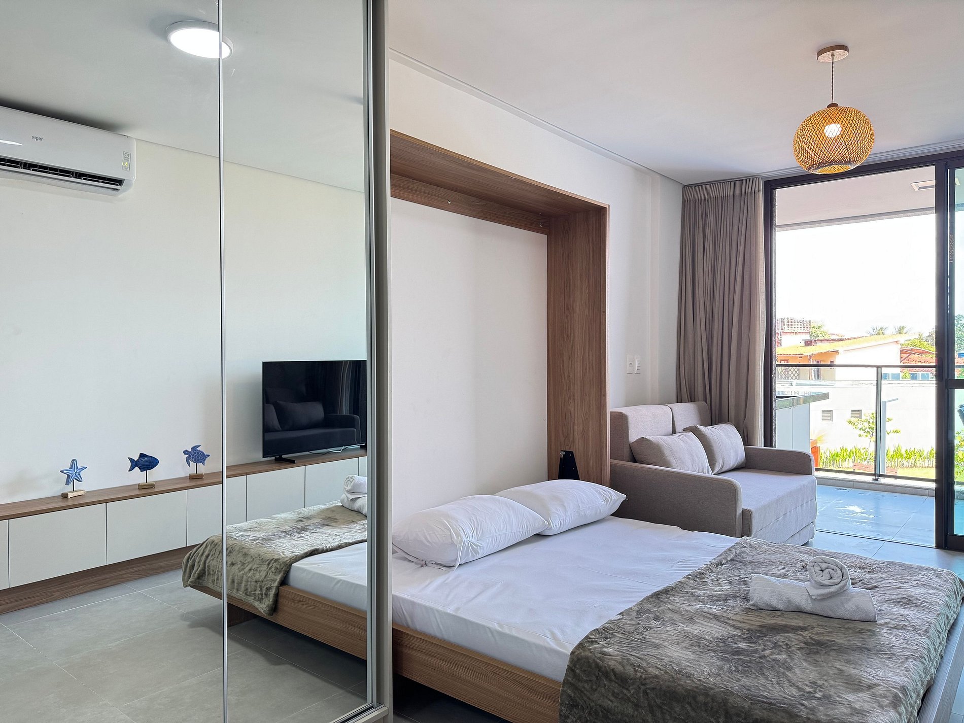 Flat de aprox. 32 m², acomoda até 4 pessoas (cama de casal tipo futón + sofá‑cama), com ar‑condicionado, TV, Wi‑Fi, banheiro privativo e varanda com vista.