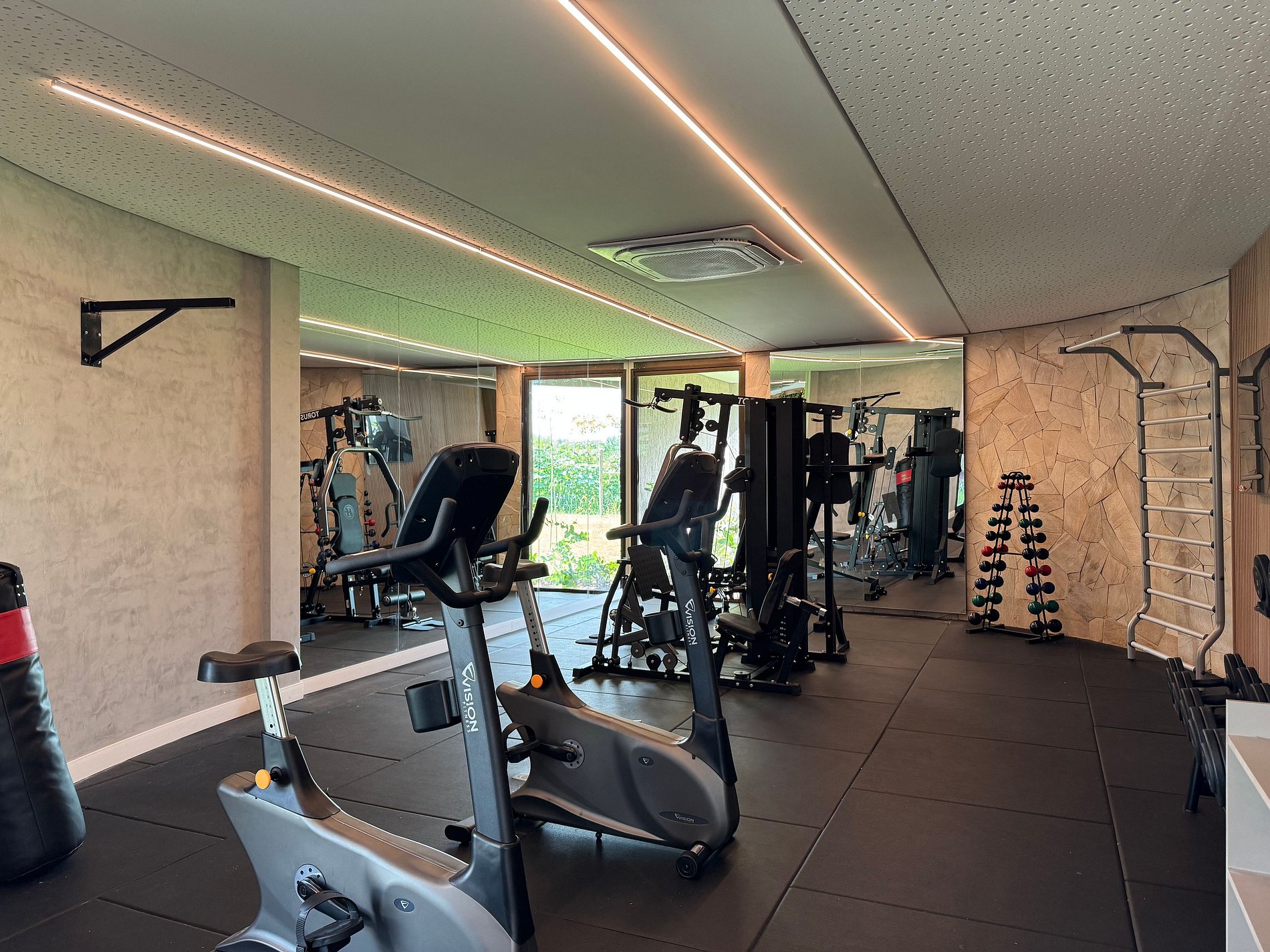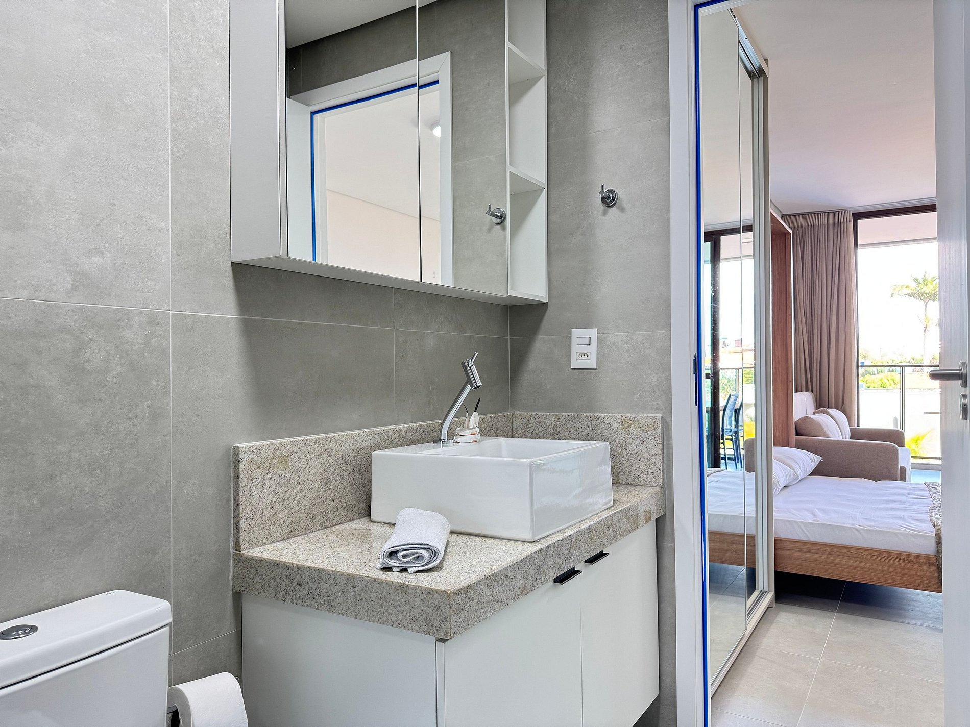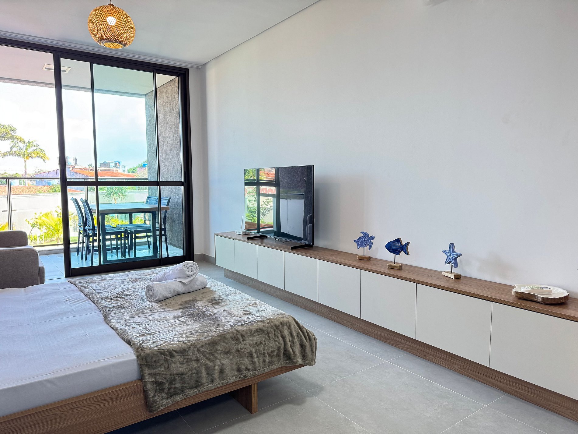Flat de aprox. 32 m², acomoda até 4 pessoas (cama de casal tipo futón + sofá‑cama), com ar‑condicionado, TV, Wi‑Fi, banheiro privativo e varanda com vista.