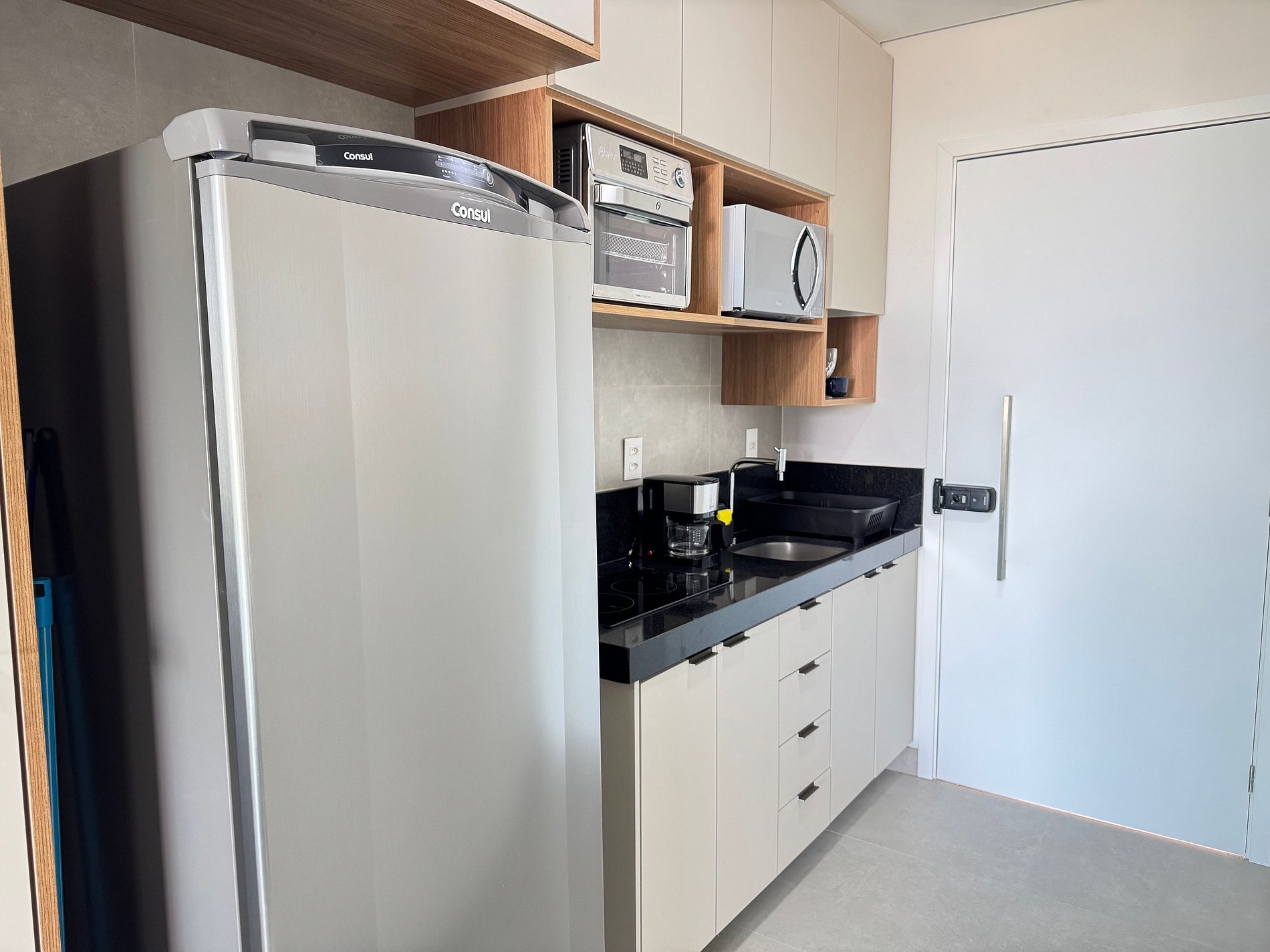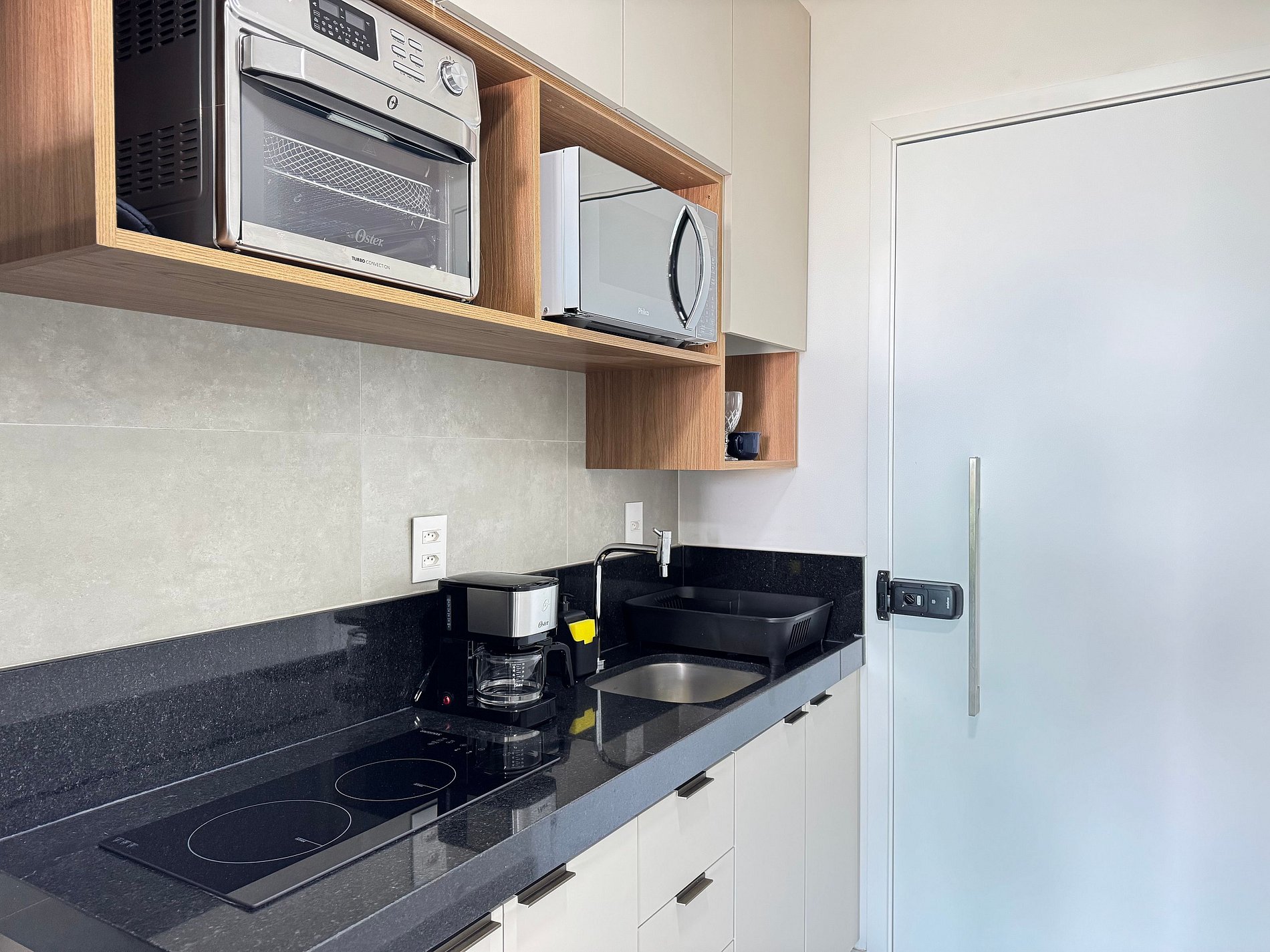 Cozinha compacta equipada com micro‑ondas, geladeira, fogão, sanduicheira, liquidificador, louças, etc. — tudo para uma estadia prática